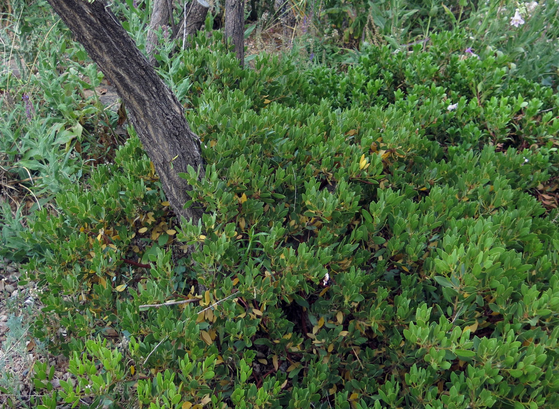 Last picture, Arctostaphylos × coloradoensis (a name given to hybrid swarms of A. patula and A. uva-ursi ….strangely sometimes called A. nevadensis, which is a species from California), hugging the trunk of the desert willow, Chilopsis linearis.