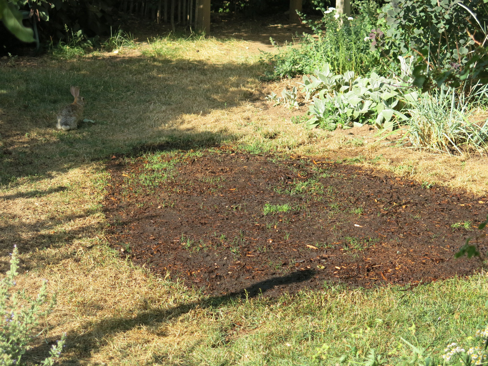 Like every red-blooded American male, the guy I live with is obsessed with his lawn. I bet he’s been sowing grass seed every single day for two months, and he just ordered a bag of Cody buffalograss seed from Stock Seed. This is to replace the mostly dead grass in the “way back” garden. The big brown area in the picture below is where he sowed some buffalograss seed, and some blue grama seed, but I think he forgot to use his Horticultural Ruler to measure the depth at which the buffalograss seed was planted. It’s only supposed to be planted ¼ to ½ inch deep. He says he might be able rake up some of the mulch and then the seed wouldn’t be planted too deeply, but I have this idea that that won’t work.