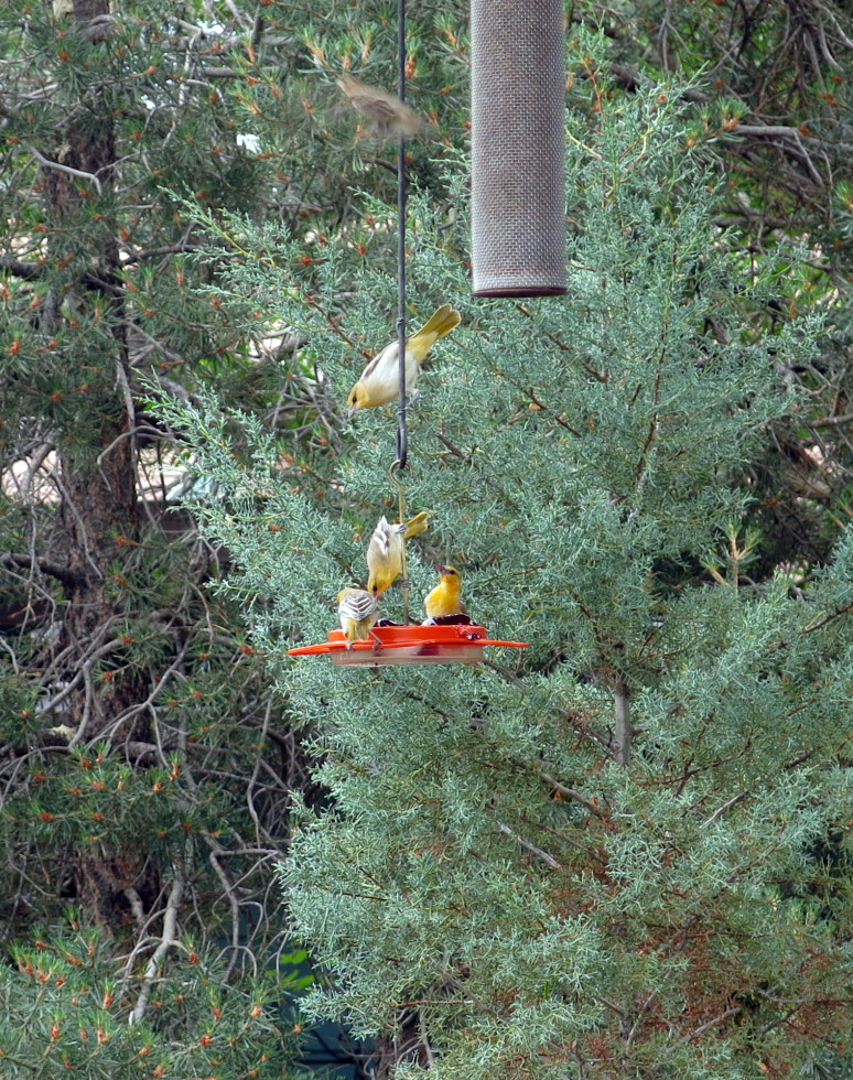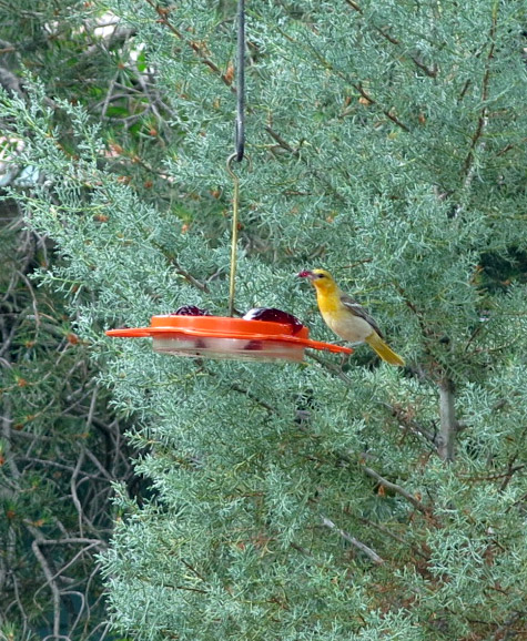 These are first year males, or so he says, eating grape jelly in the feeder.