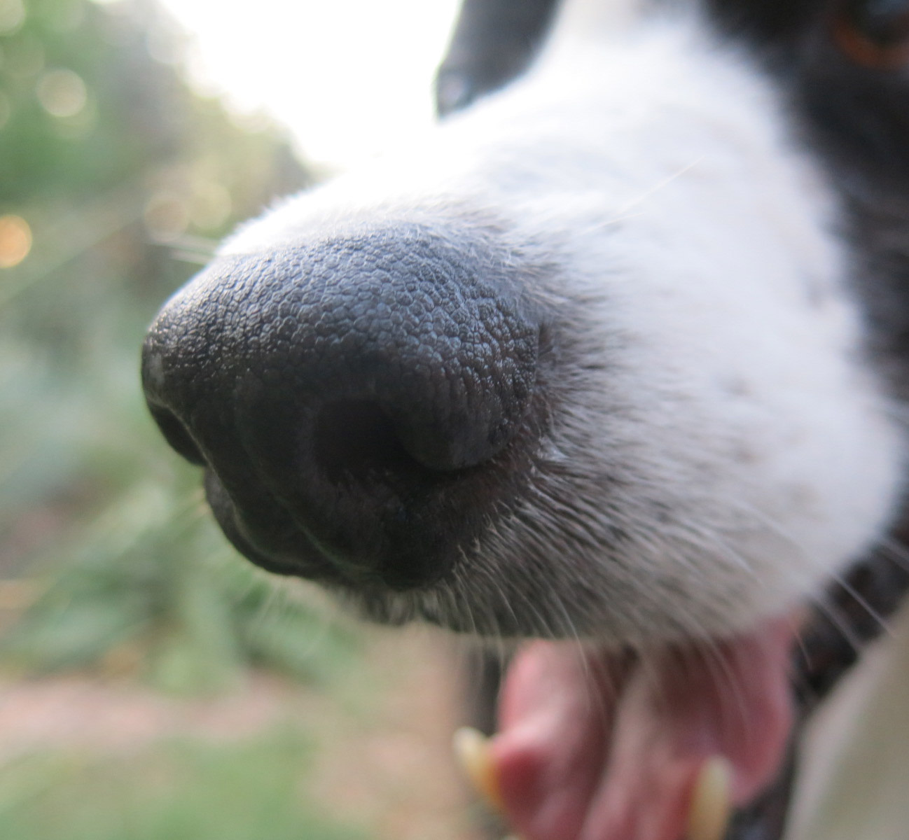Greeting and salutations, everyone. Once again it is I, Chess the purebred border collie, filling in for the guy I live with, who is busy staring at the floor again. You may remember me from such posts as “Still More Spring” and “Memory and Desire”, among other excellent contributions to English literature. Today I would say “here I am in a characteristic pose”, but the guy I live with thought this was funnier. Granted, it’s an excellent nose, and I bet the guy I live with is jealous, but this is no way to treat someone who helps hold down the ultra soft Pottery Barn sheets when the fan is blowing in cool night air. You can see the little scar, even. I forget how I got that.