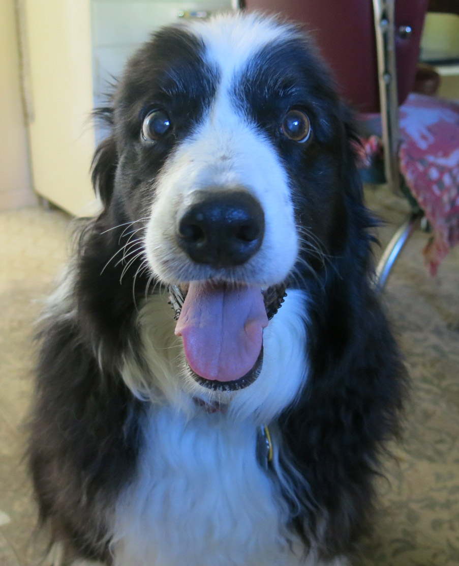 Namaste, everyone; once again it is I, Chess the purebred border collie, filling in for the guy I live with. I’m here to bring you the most memorable posts a border collie can provide. You may remember me from such posts as “A Beautiful Day” and “Border Collie Weather”, among other delights. Here I am in a not wholly characteristic pose, since I’m being forced to have my picture taken against my will (I would rather have been eating right at that moment), and so my ears are way back.