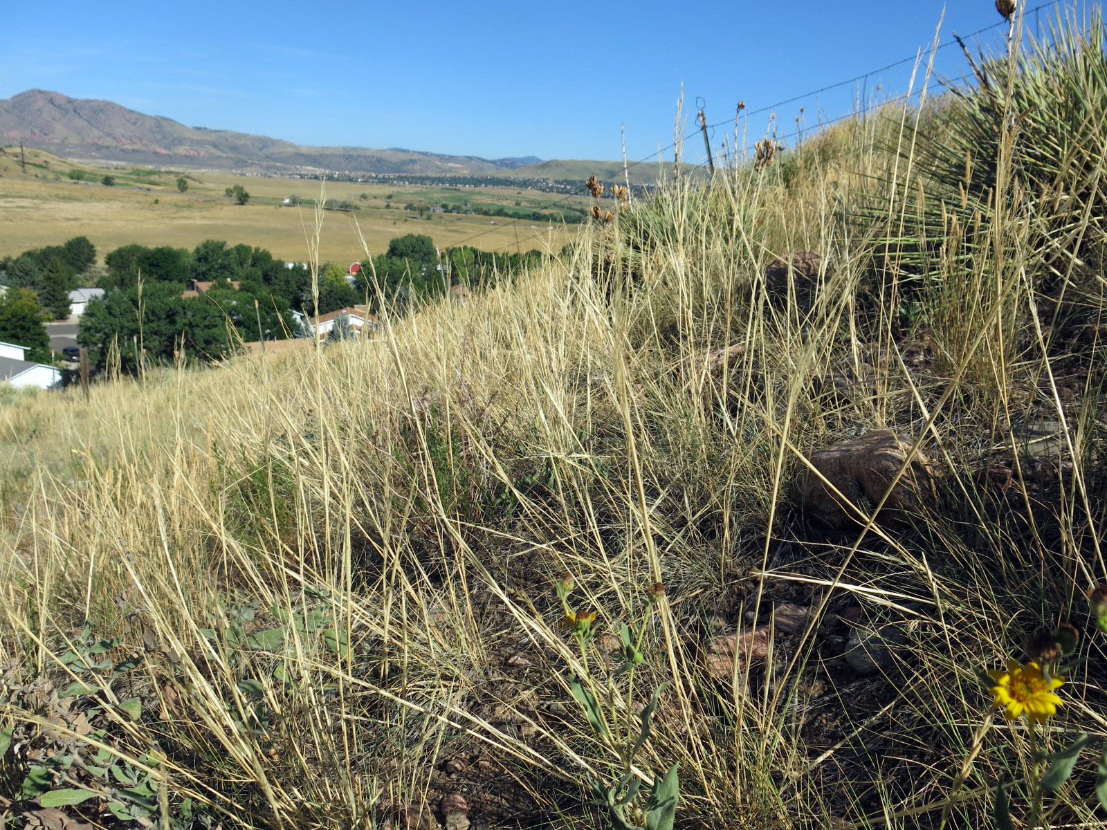 There’s some vegetation here, too. Needle-and-thread, Heterostipa comata. Helianthus pumilus in the lower right. You can see how steep the path is.