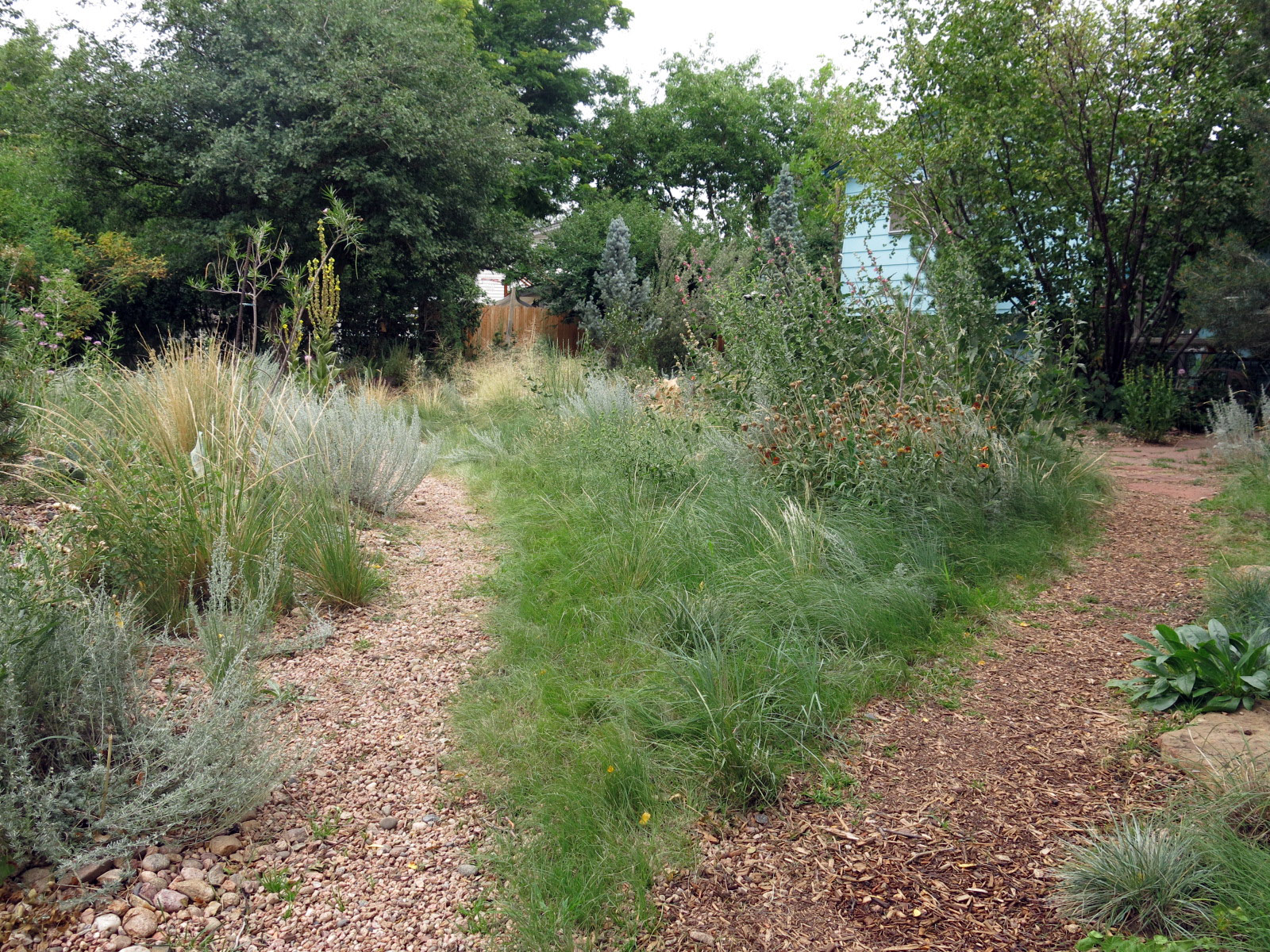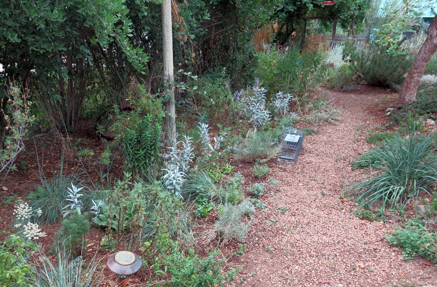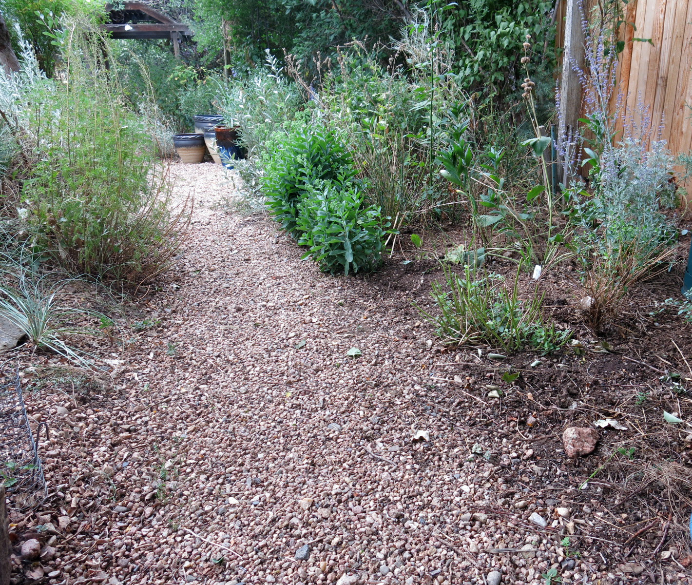 True, the path has always only needed to be wide enough for a border collie, and I almost never use this path any more, except to help the guy I live with pull the hose along, because I have this one, which we’ve shown pictures of before, but now it’s got the wood mulch he promised it would have. I might point out to him that this path is sort of in a straight line, but it would probably do no good at all.