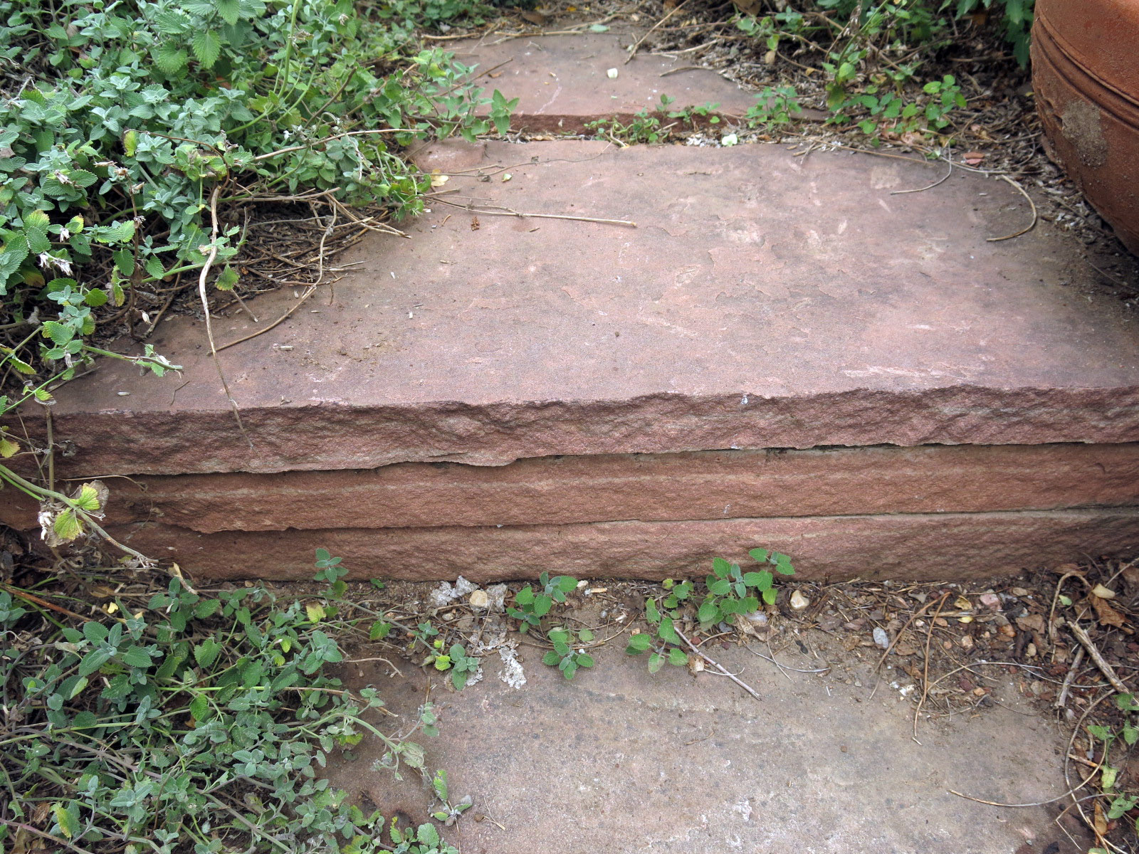My mommy, who did most of the actual design here (instead of just digging and then planting and saying “Look, a design”), would have none of this no straight lines business. Here are the steps she built up to the patio. They’re as level as anything can be.