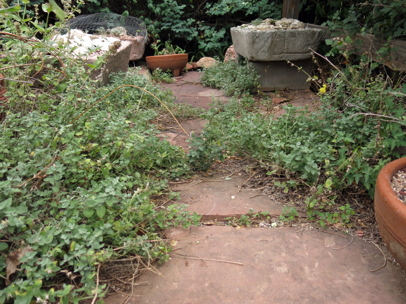 The extra catmint, the trough covered with chicken wire, and the crooked bowl filled with cactus, are artistic touches the guy I live with added later.