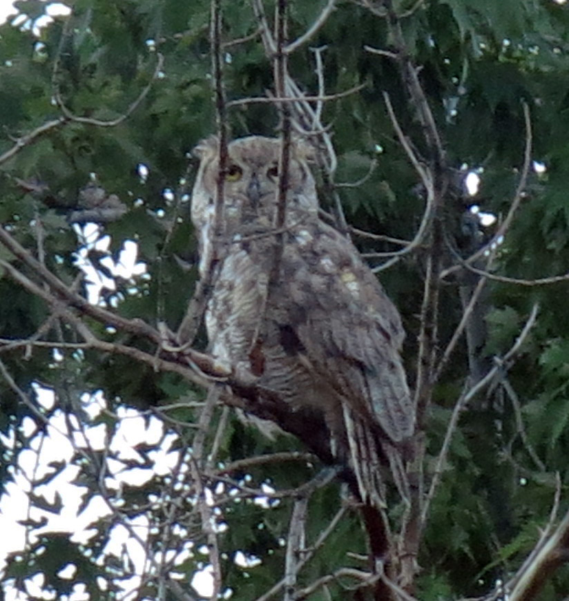 So that’s what’s going on. I thought this wasn’t all that interesting, but later in the evening, when the guy I live with was looking for the end of the hose (he says “Follow the hose and you’ll find the end”, which I guess he thinks is really “deep”, since he came of age in the Sixties), and the big scary owl was in the way back doing owl things. It flew off, across the green belt. Same tree as before.