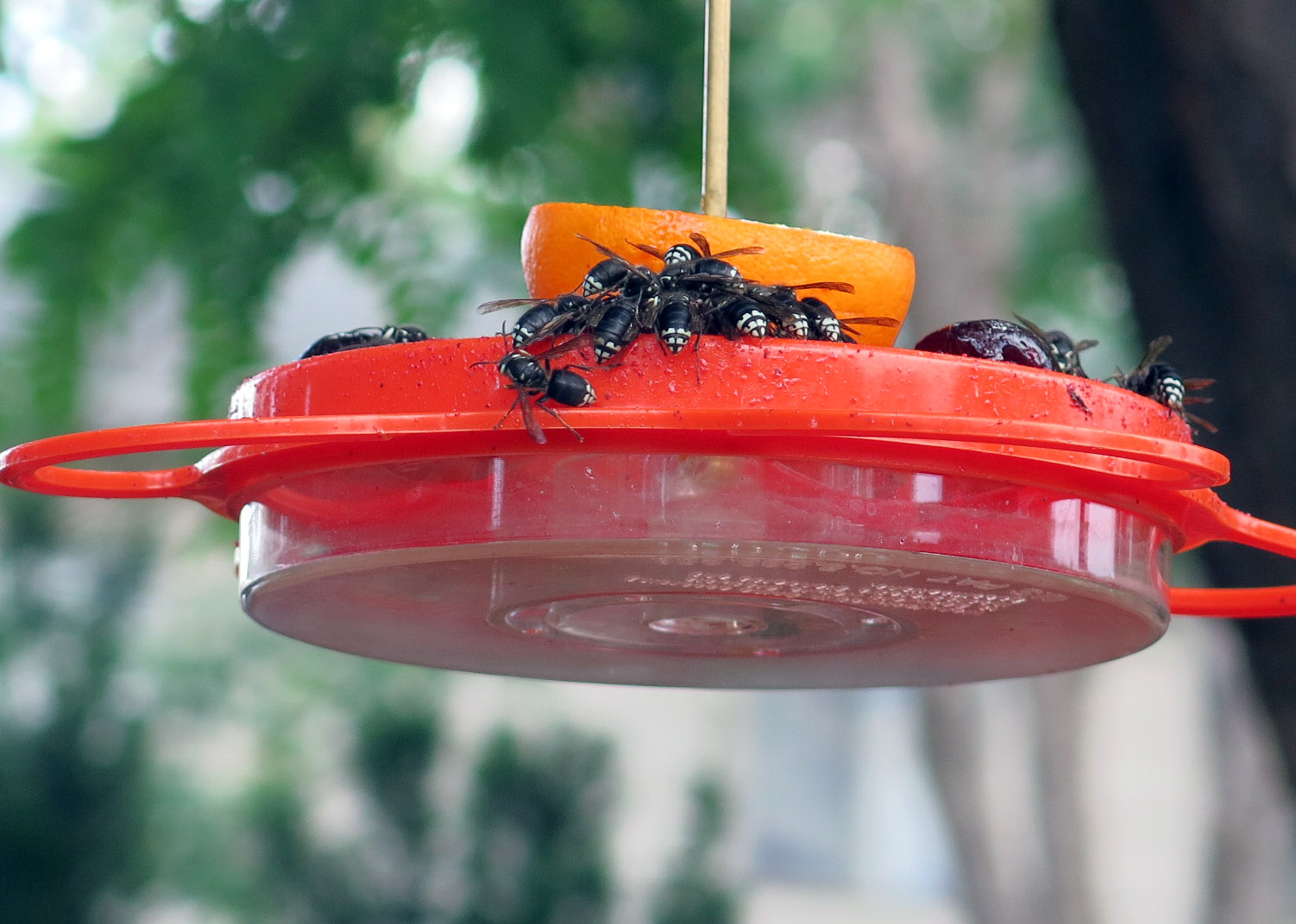 What else? The oriole feeder is still attracting lots of orioles, but also some non-oriole visitors. You should see them when the guy I live with takes the feeders down for “rejellification”. He uses one of those grabber deals to get the feeders, even though the hornets don’t seem to have any interest in stinging him….yet…but they do follow him back to the patio to see what’s what with the grape jelly.