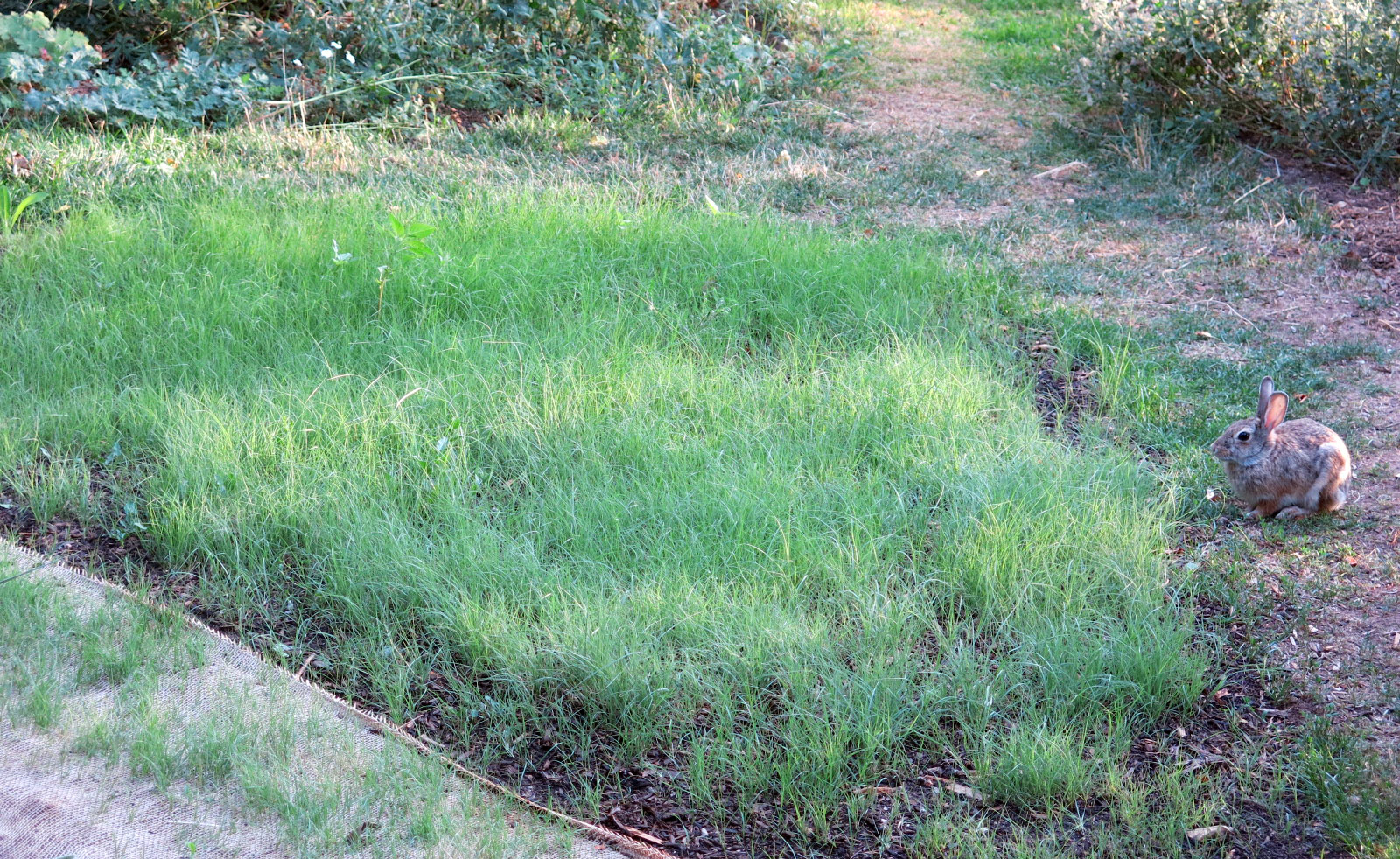 In other news, the buffalo grass lawn in back is coming in nicely. The guy I live with was so impressed with The Dry Garden Handbook by Olivier Filippi that he wanted the author’s new book, Alternatives au gazon, which he had to order from France. You can see the gazon here, still a gazon but definitely alternatif, with sustainable lawnmower ready for duty. (Incidentally, the guy I live with says gazon is also a word in English, having to do turf on fortifications.)
