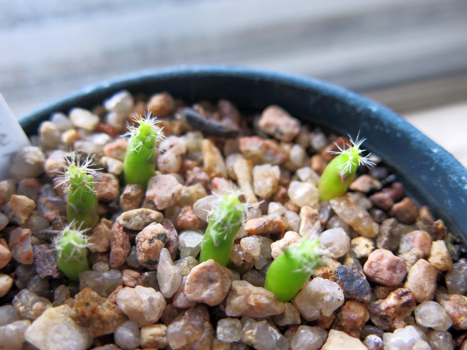 Back in January, the guy I live with sowed a bunch of cactus seed in pots, outside, and put them in the seed frames, and forgot about them. Two days ago he was watering the pots in the seed frames, right before it rained, and this is what he found.