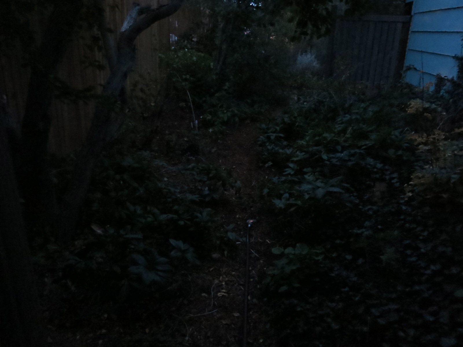 The shade garden. He forgot that the sprinkler was there. He planted some little oaks yesterday and wanted to give them a good drink.