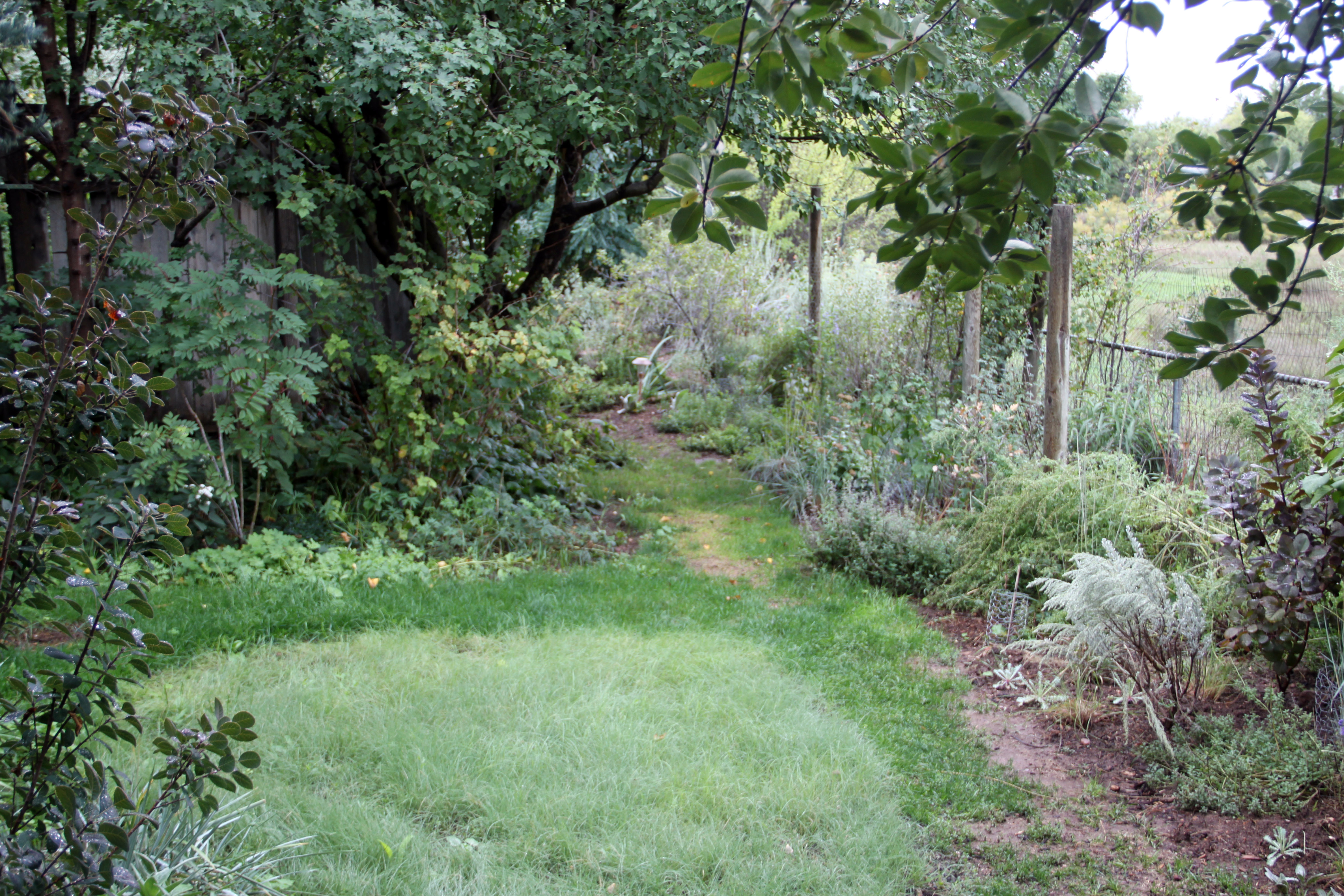 The way back; the lighter grass is the blue grama and buffalo grass he sowed earlier this year. The poles are where the owls sit.