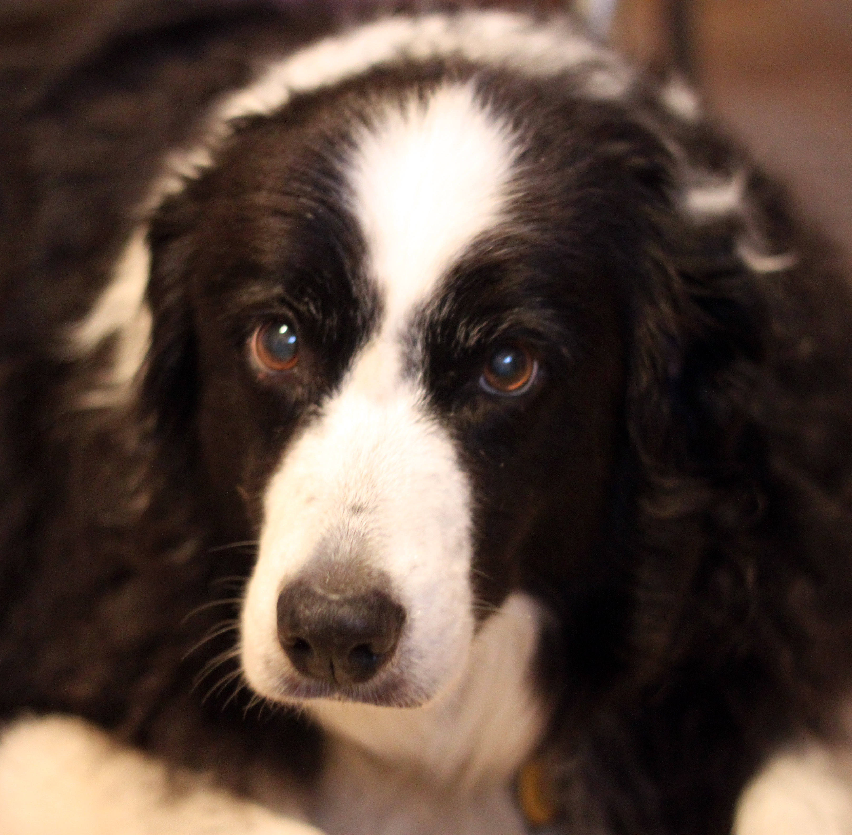 Here I am in a characteristically serious pose. My mommy used to make fun of the way my muzzle was shaped, not pointy like a regular border collie, which is probably why I was her favorite; besides, I was three-quarters (or two-thirds, I forget) the size of my buddy Slipper. This can be like my official portrait. Until the next one, anyway.