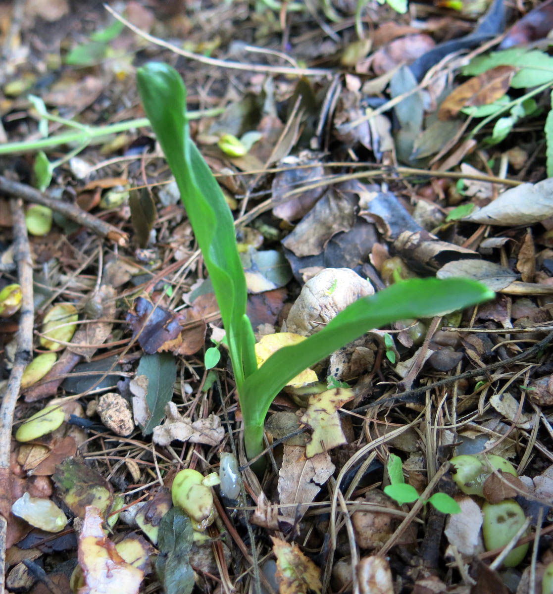 And this unimpressive green thing is what he says is the foliage of Biarum tenufolium. There are a bunch of these things in the rock garden and almost nothing has ever happened. Except last year.