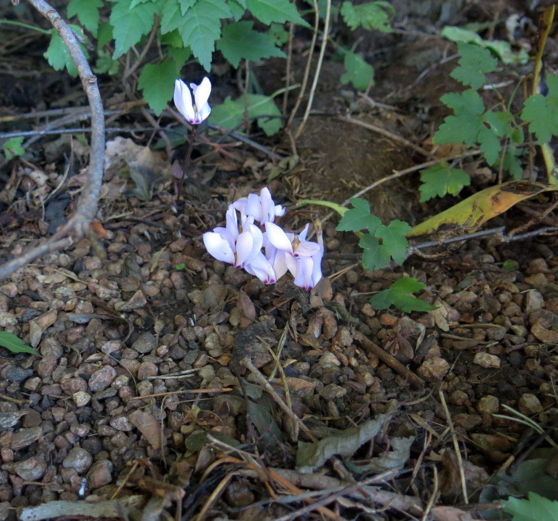 Finally, one blooming under a bunch of shrubs. Maybe this is Cyclamen hederifolium. He couldn’t creep in there far enough to look at the flowers. It was sown by ants.
