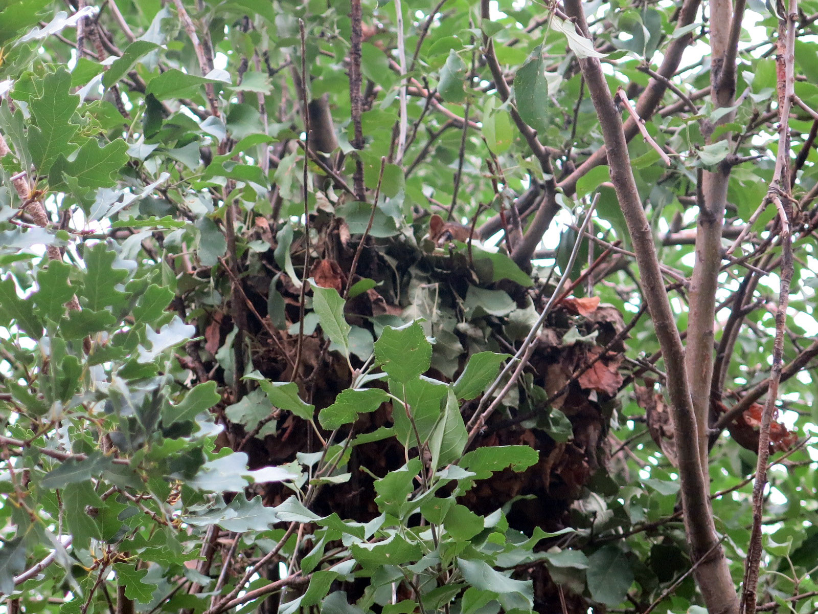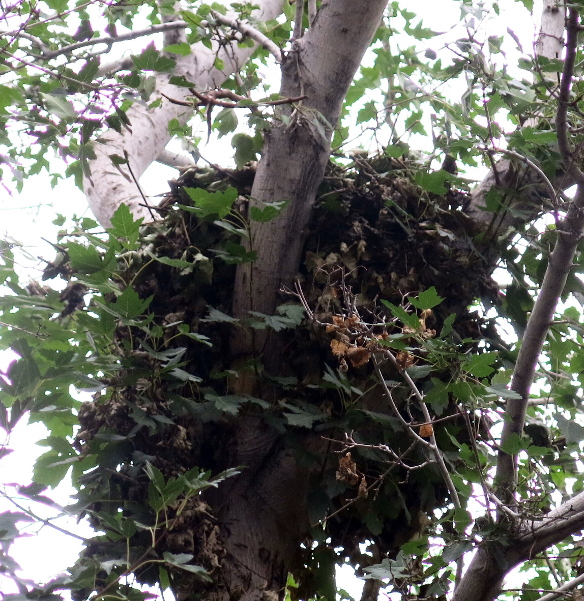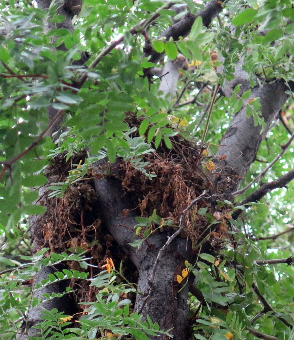 So he planted and planted, and then planted some more, and when he was all done, he decided, for no reason I could think of, to take pictures of the squirrel nests in the yard. This one is way up in the honey locust.