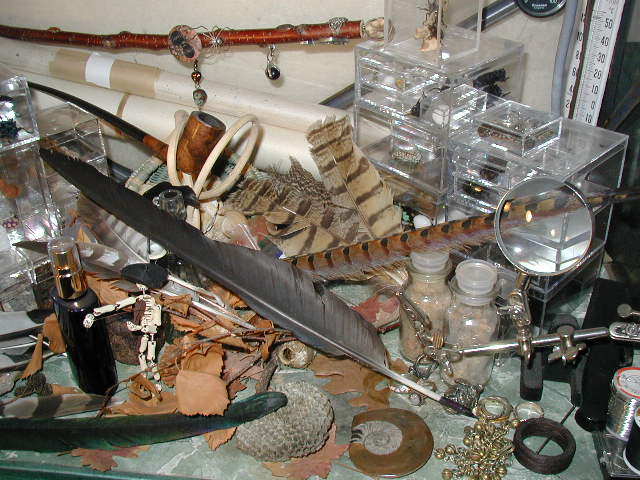 I recognize owl feathers on the desk, and pheasant and stellar jay…but what is the green one? Magpie?