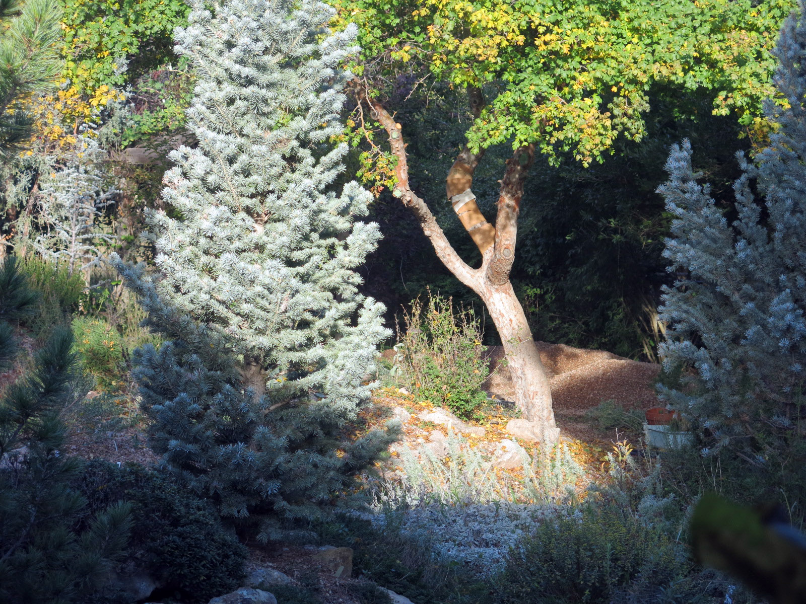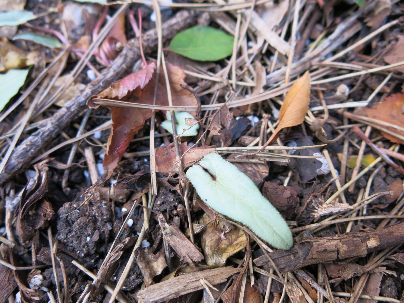 Then he went into the side yard, the shade garden, to take a picture of a new form of Cyclamen hederifolium, “Arrow Leaf Silver”, or something like that. Yes, that’s really a cyclamen leaf. Only the guy I live with would take a picture of one leaf. (I know, there are two there, and some in the upper left, out of focus.)