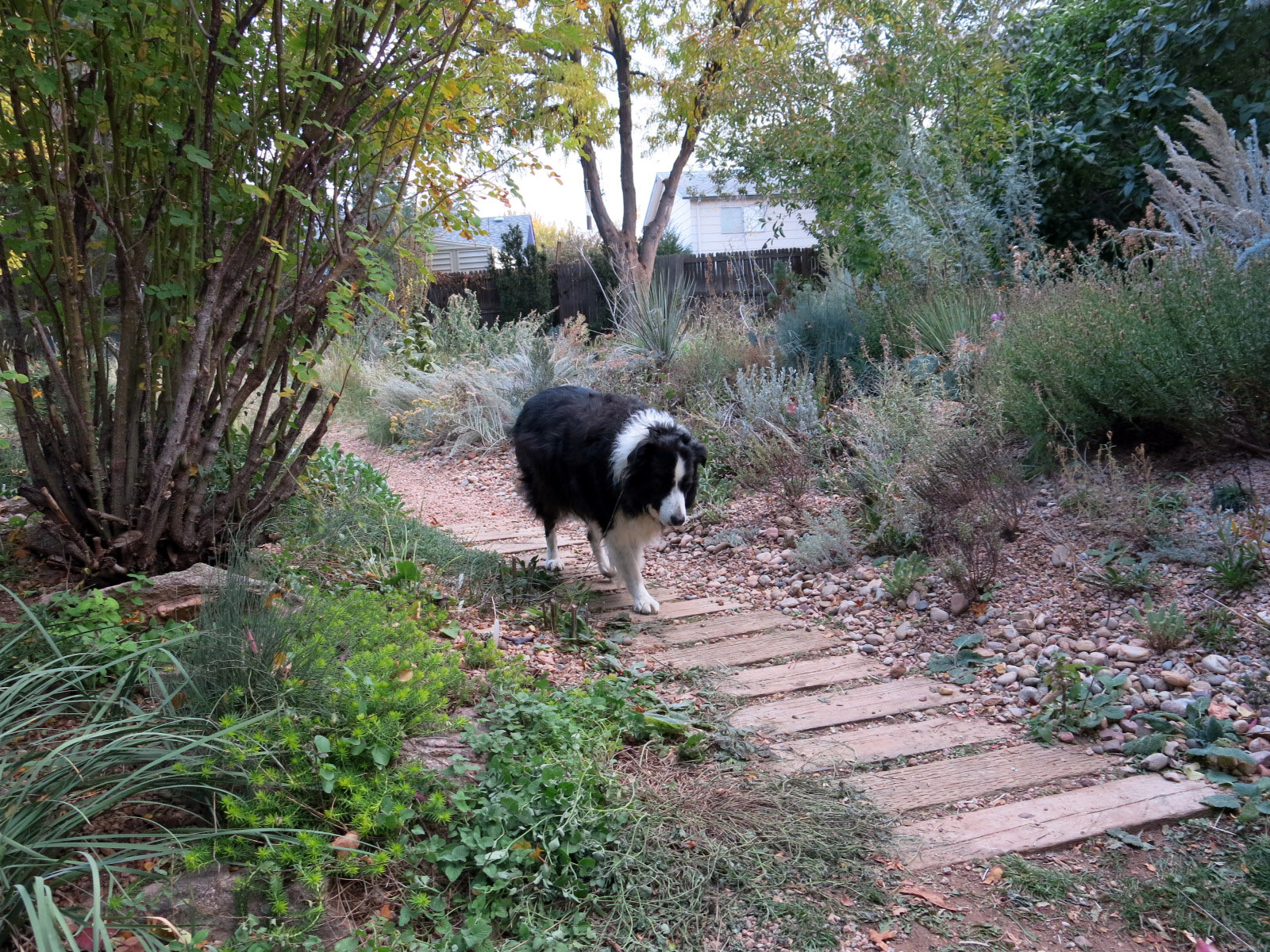 Anyway, he was out there today making these artistic noises, so I came out to see what was going on. It isn’t very often that I hear artistic noises out in the garden, you know. The path I’m walking on was called “Pooka’s Shortcut”, because my uncle Pooka decided to make a shortcut through the garden rather than wasting valuable time running around the garden in order to see what was going on out in the back. Makes sense to me. My mommy added the boards, and made the guy I live with do all the sawing.