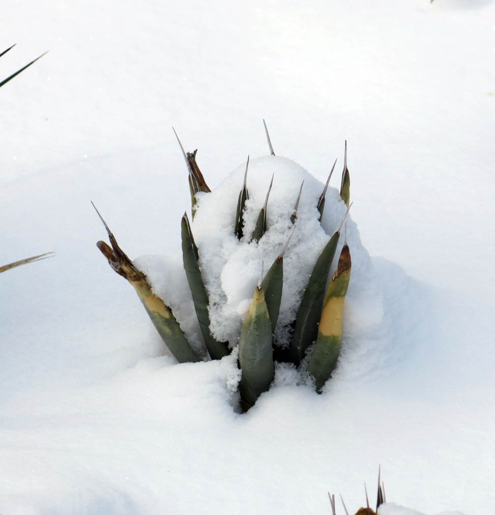 The guy I live with says it’s a complicated thing. And I quote: “Some species of agaves will tolerate very cold temperatures if they are kept completely dry during the period of cold. The snow on the ground here is too cold to melt, and so plants experience it as dryness. This is a good thing.