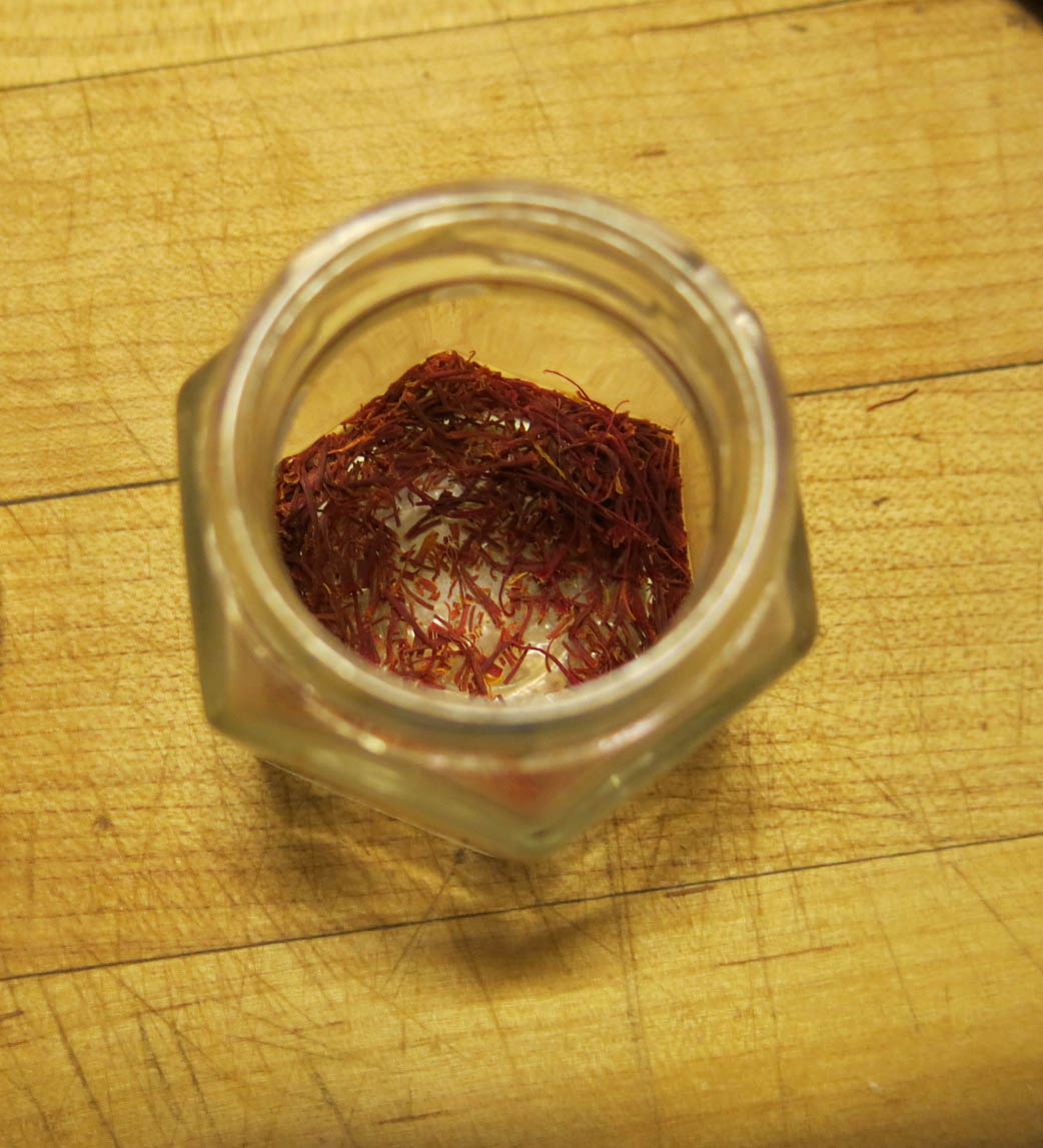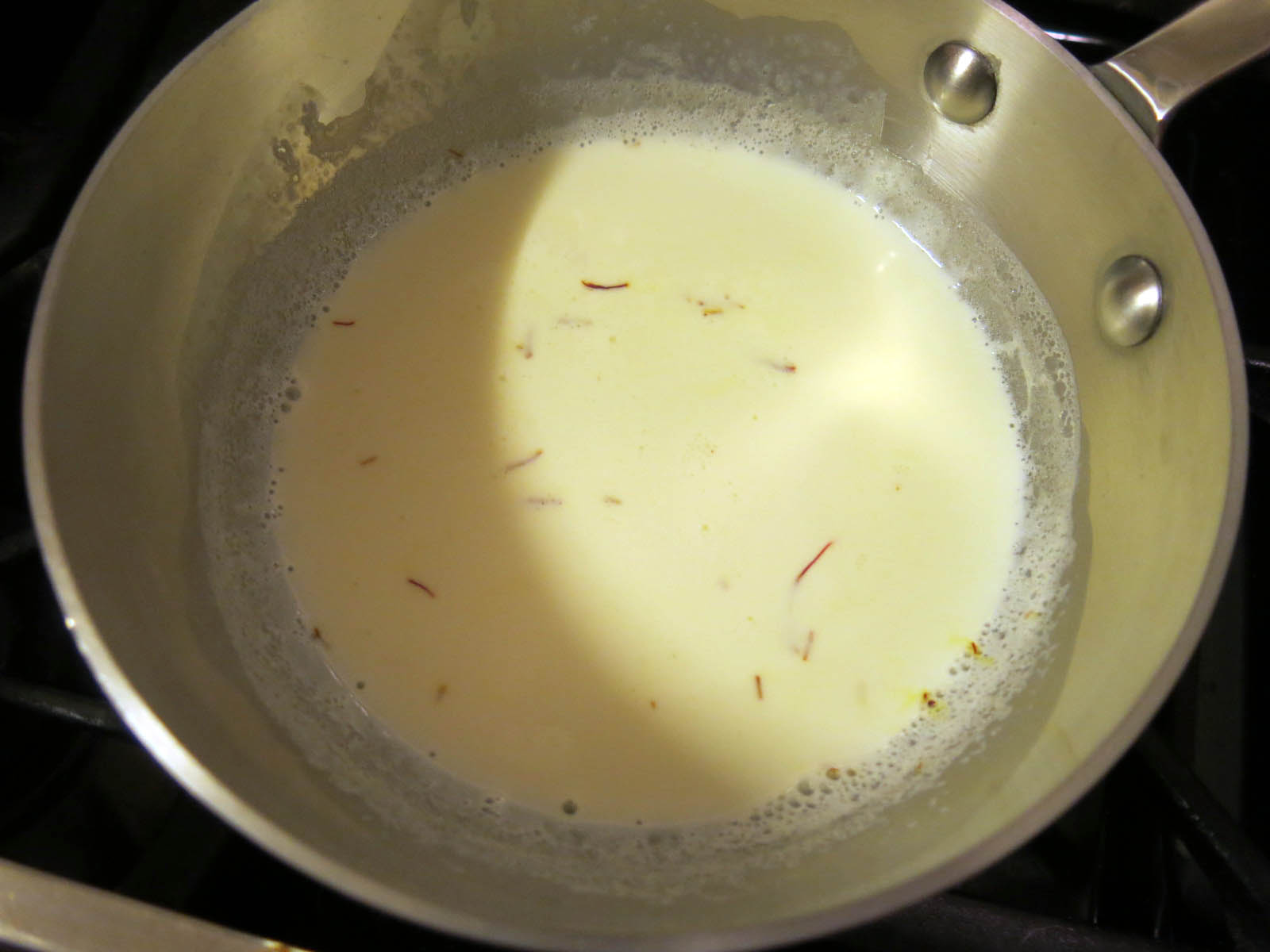 Meanwhile, you heat some cream or half-and-half, and add some saffron threads. My mommy used to collect saffron threads every autumn.