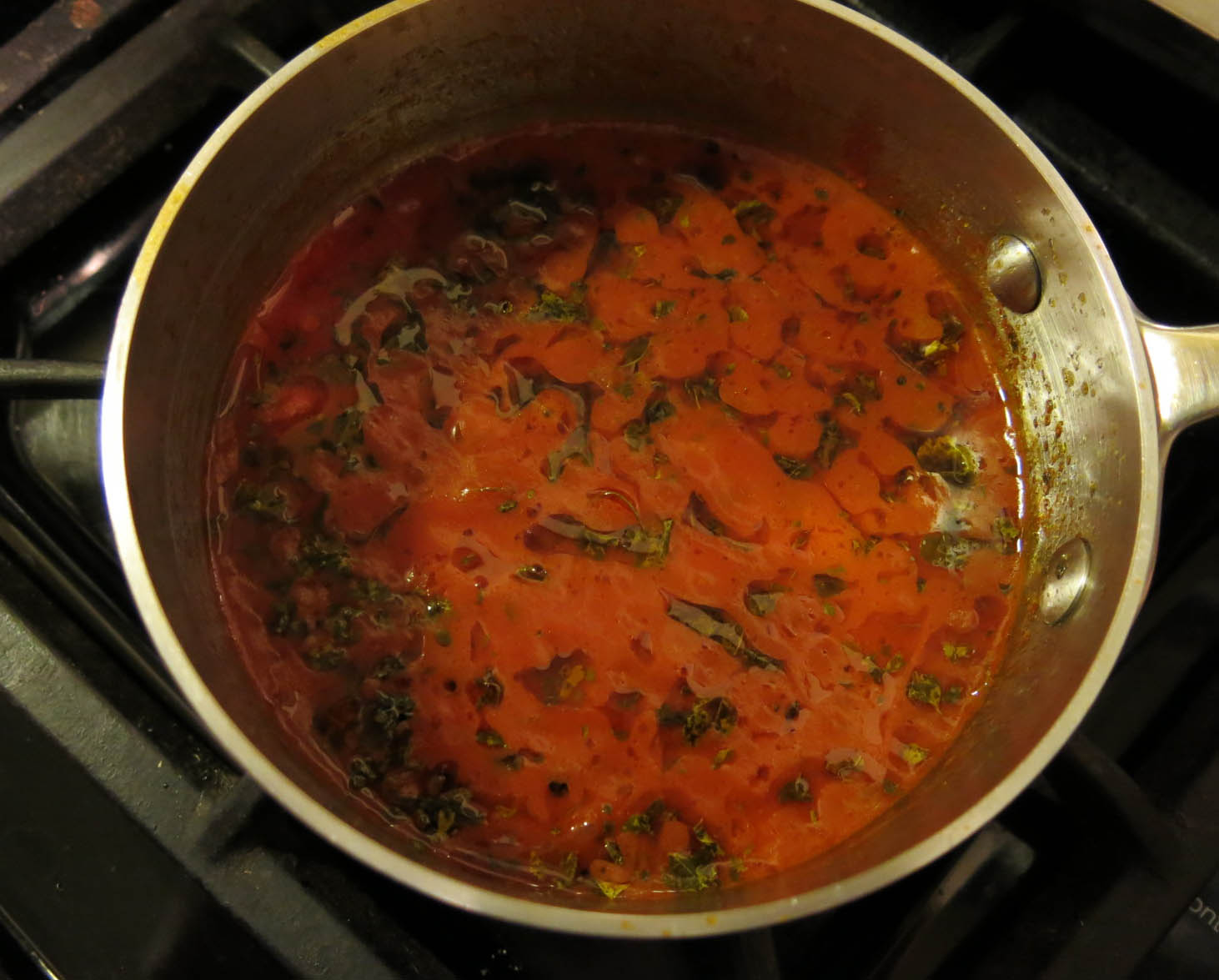 The sauce is 2T ghee (pure cow, of course), half a cup or so tomato sauce, 2T dried fenugreek leaves, a little cayenne and some salt. Cooked for about ten minutes, covered, to marry the flavors. You can use fresh or frozen fenugreek too. You will smell like fenugreek for a couple of days. Not a bad smell.