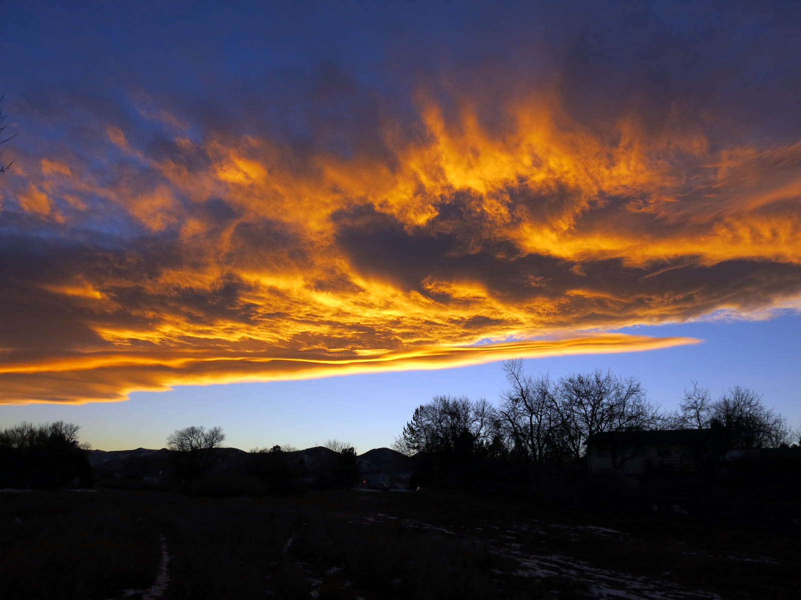 It was windy all day long, it felt a little like spring, and the snow has been melting pretty quickly. Except in our yard, where the “melt-proof” snow fell. Or so says the guy I live with. There was a mountain wave cloud because of the wind rippling over the mountain tops to the west of us. The lower cloud is a typical mountain wave one.