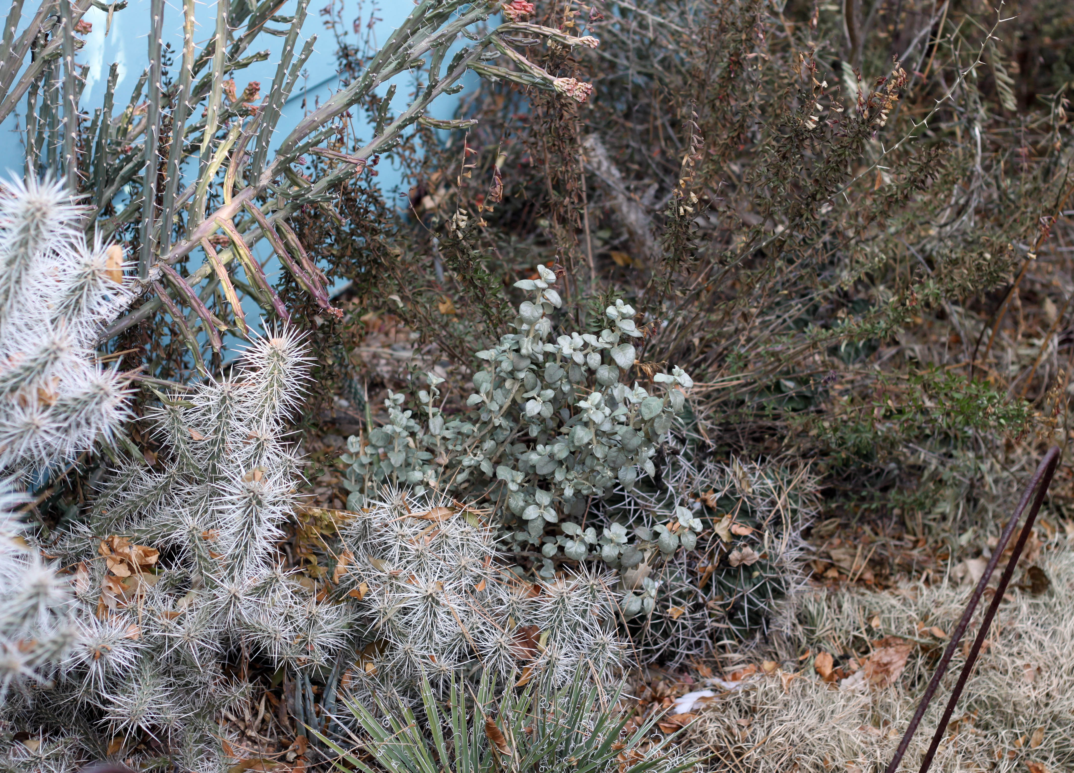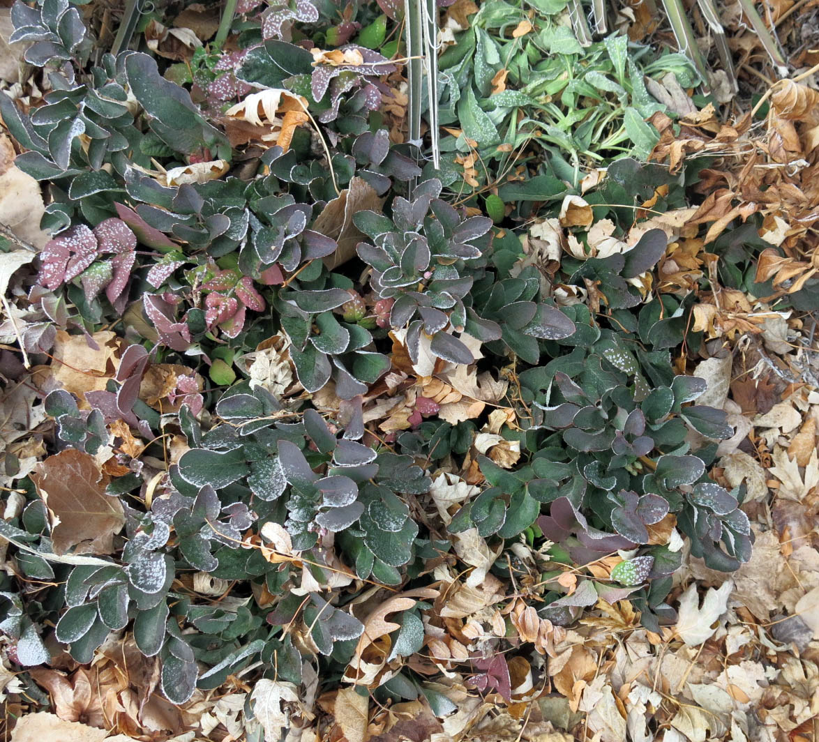 And here’s a self-sown Mahonia repens covered with frost. This was taken last Sunday. We don’t often have frost here because of the low humidity, but it was really humid last weekend. 89 percent.
