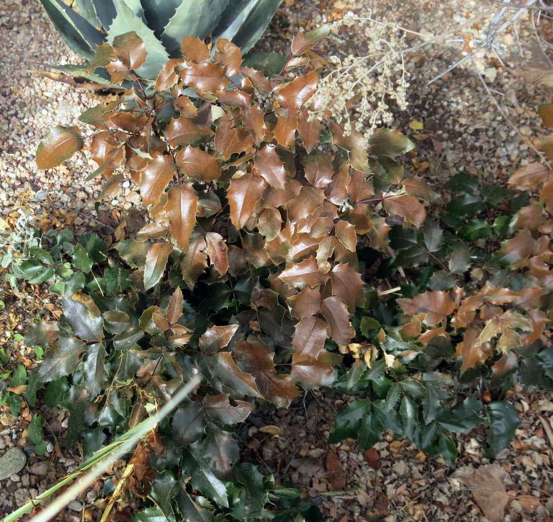 Mahonia aquifolium, also self-sown, with caramel-colored leaves. (They may look dead and dry, but they aren’t.)