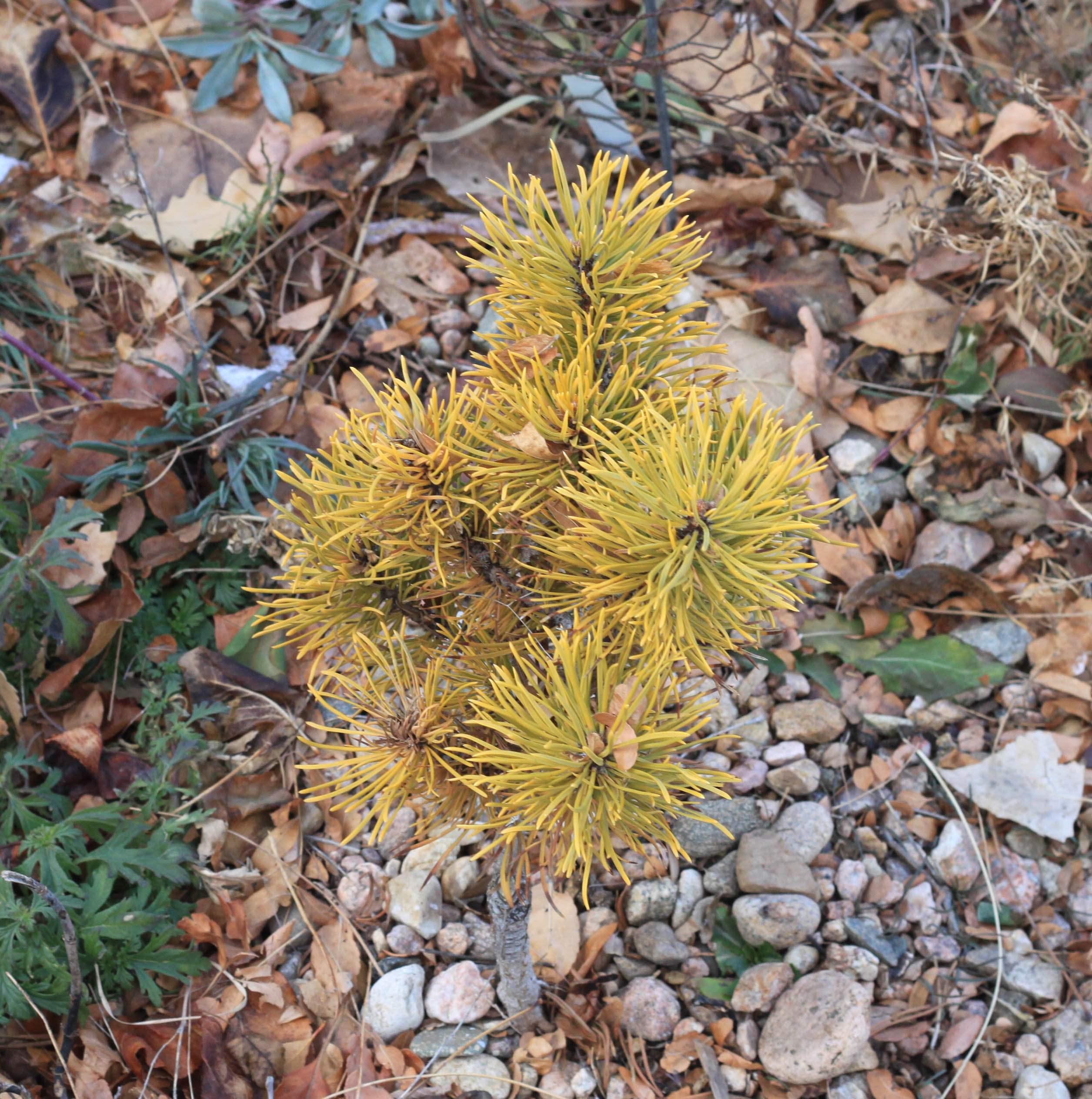 Pinus mugo ‘Carsten’s Wintergold’. The guy I live with says he likes conifers that turn golden in winter so much he might buy a bunch more, so there will be something to look at.