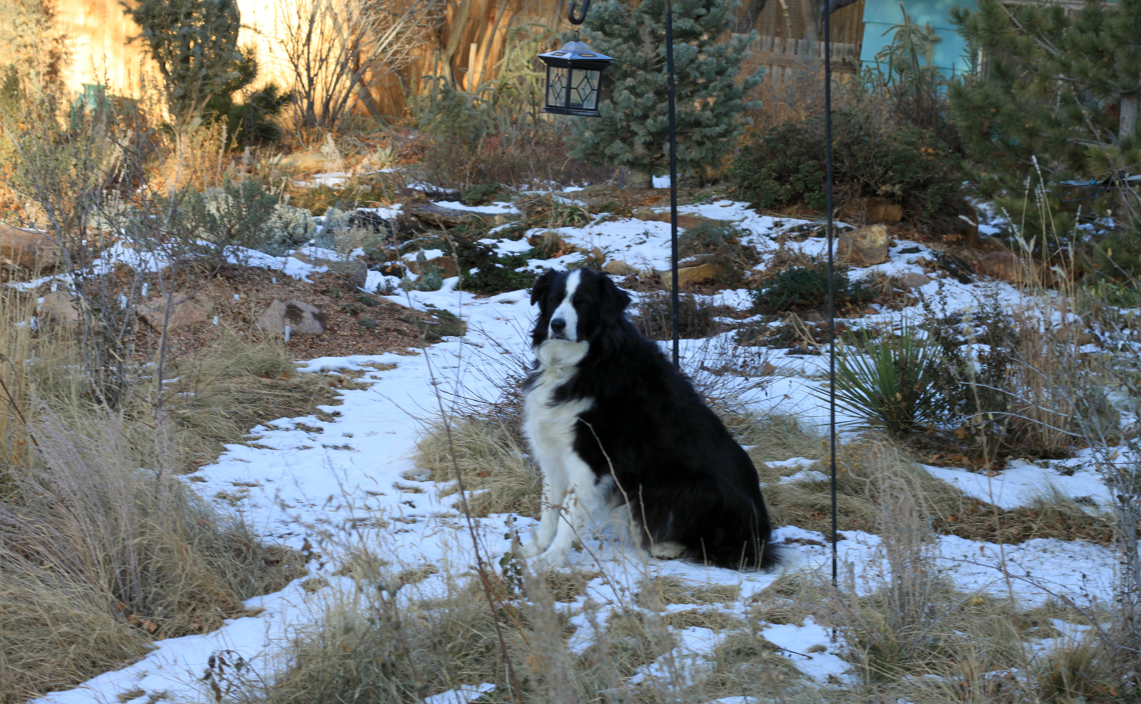 I do, actually, have a cape. It’s the extra-wooly part behind my neck that most purebred border collies don’t have. None of the pictures was taken from my viewpoint today. (Notice, for once, my impeccable grammar.) The guy I live with was supposed to get a wreath for the front door, just to be seasonal, but he didn’t. Probably because he forgot, not because he was being a Scrooge. He could go out tomorrow, but said he wouldn’t, because he went out today. It’s okay; I know there’s a wedge of Brie in the refrigerator (though I particularly liked the Cypress Grove Lamb Chopper and Delice de Bourgogne that was here last week), and I also know there are some “all natural” cow ears just for me. (The guy I live with doesn’t want to try them.) He did consider buying a couple of Christmas trees to use their branches for winter protection of plants, but maybe that’s too late for the plants that needed protection ….. It’s supposed to snow tomorrow, then be nice (>50F) for about a week.