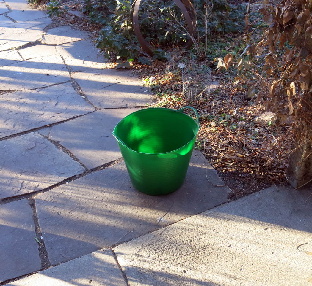 Hmm, a bucket. I was promised a plant sprayer in a Christmas IOU, so nothing odd about a bucket. Is this one sturdy? I have had one or two buckets which beguiled by their looks but really could not carry weight. At any rate, Bucket Green is a great green. Should serve as well as bright orange for not being lost in the garden.