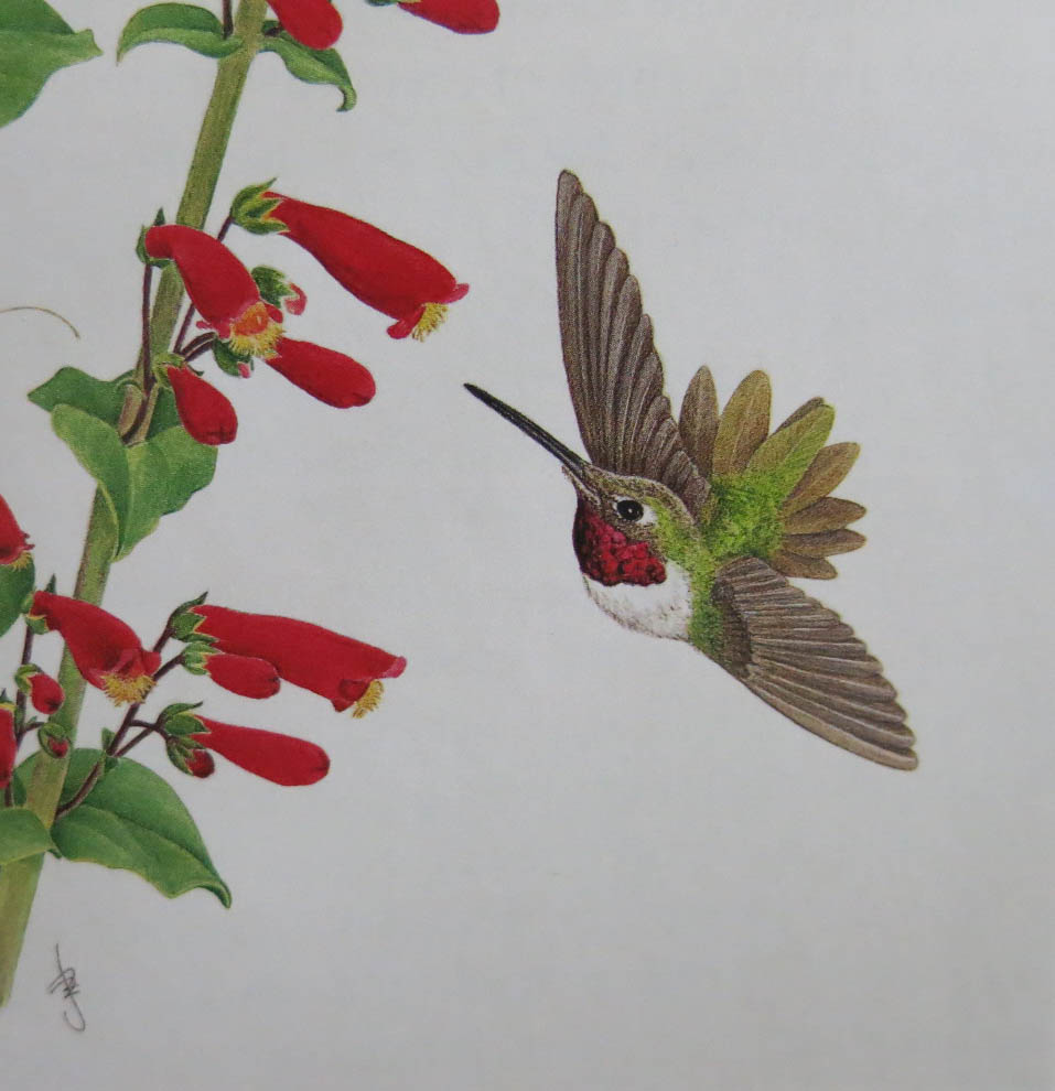 Your mommy’s art is beautiful, penstemon and broad-tailed hummingbird wonderfully captured. She makes the hummingbird look like one with which I’d like to have a conversation. His red breast seems to mirror the gorgeous cushion on your sleeping couch.