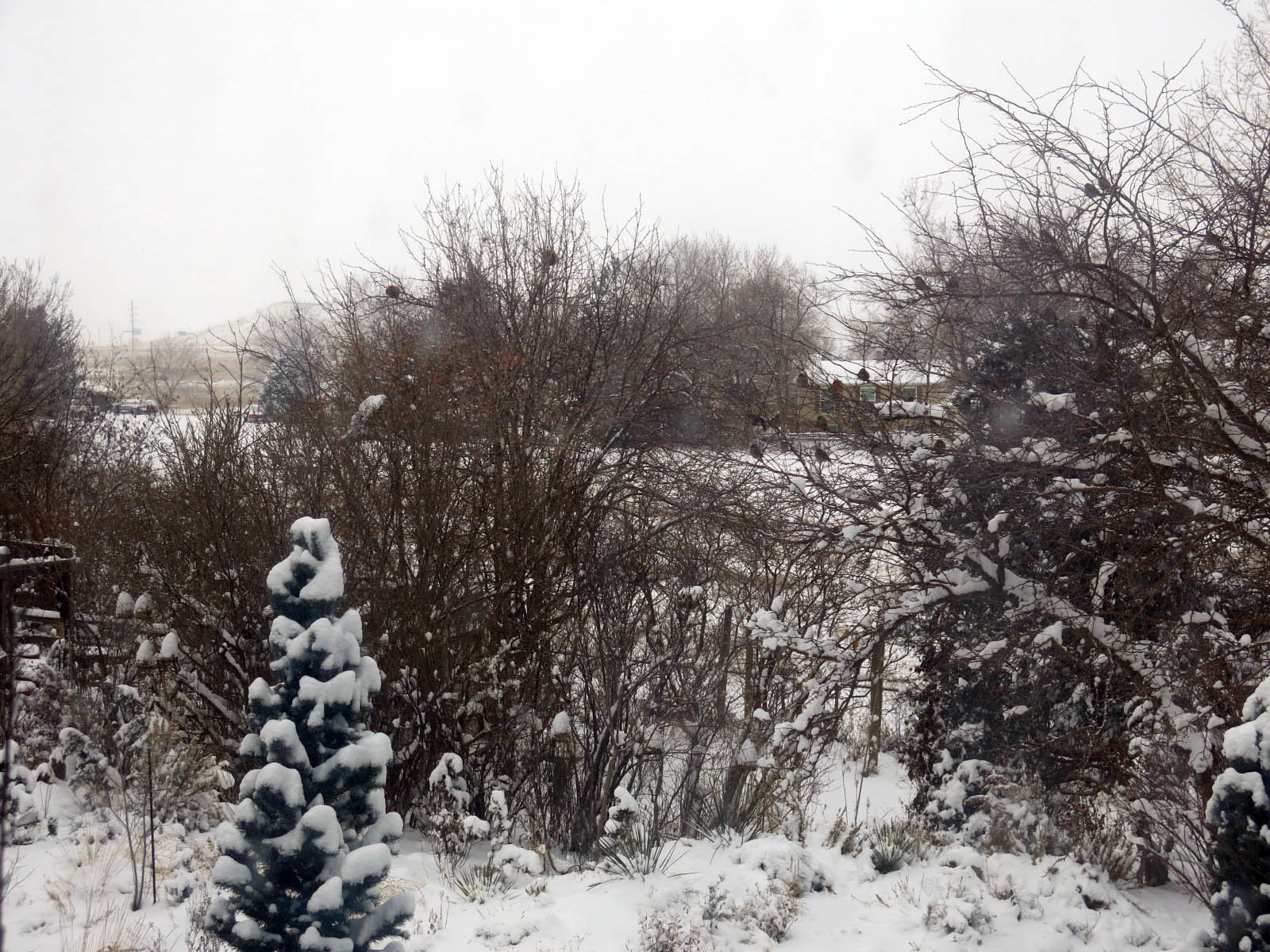 It’s still really snowy outside, as you can see from this picture taken from the upstairs bedroom window. Those two dark things in upper left center, in the Wasatch maples (Acer grandidentatum) are squirrels, huddling against the cold, which it is.