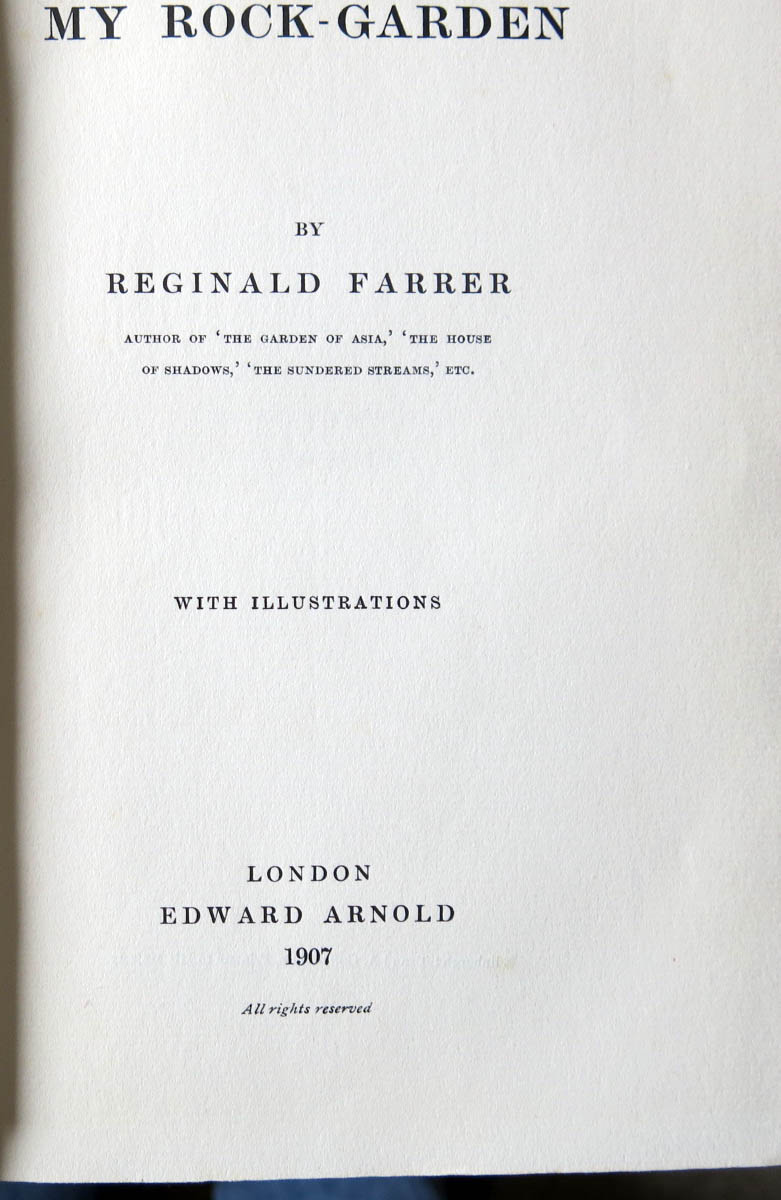 The ones by Farrer were all reprinted, by Theophrastus in the 1970s, I think, and later, by Timber Press. The Dutch book, Rotstuinen, is pretty amazing; the author makes rock gardens out of recycled materials. http://www.flickr.com/photos/fransdewit/5108401352/ It also shows the fantastic rock garden in Brno. Slide show here. http://oldgardens.net/2013/01/29/botanic-gardenarboretum-of-mendelove-university-brno-czech-republic/#jp-carousel-289