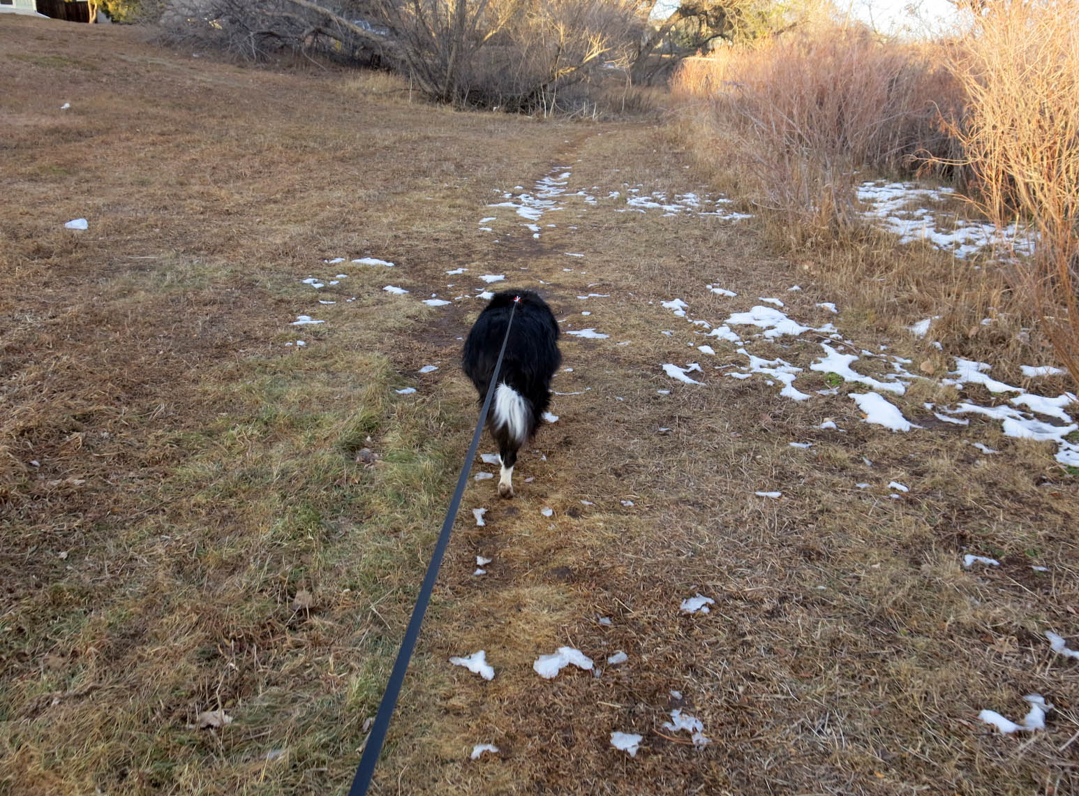In fact, here I am on my walk. The sun had gone behind a cloud or something. The path ends beyond that patch of snow, and then we turn around.