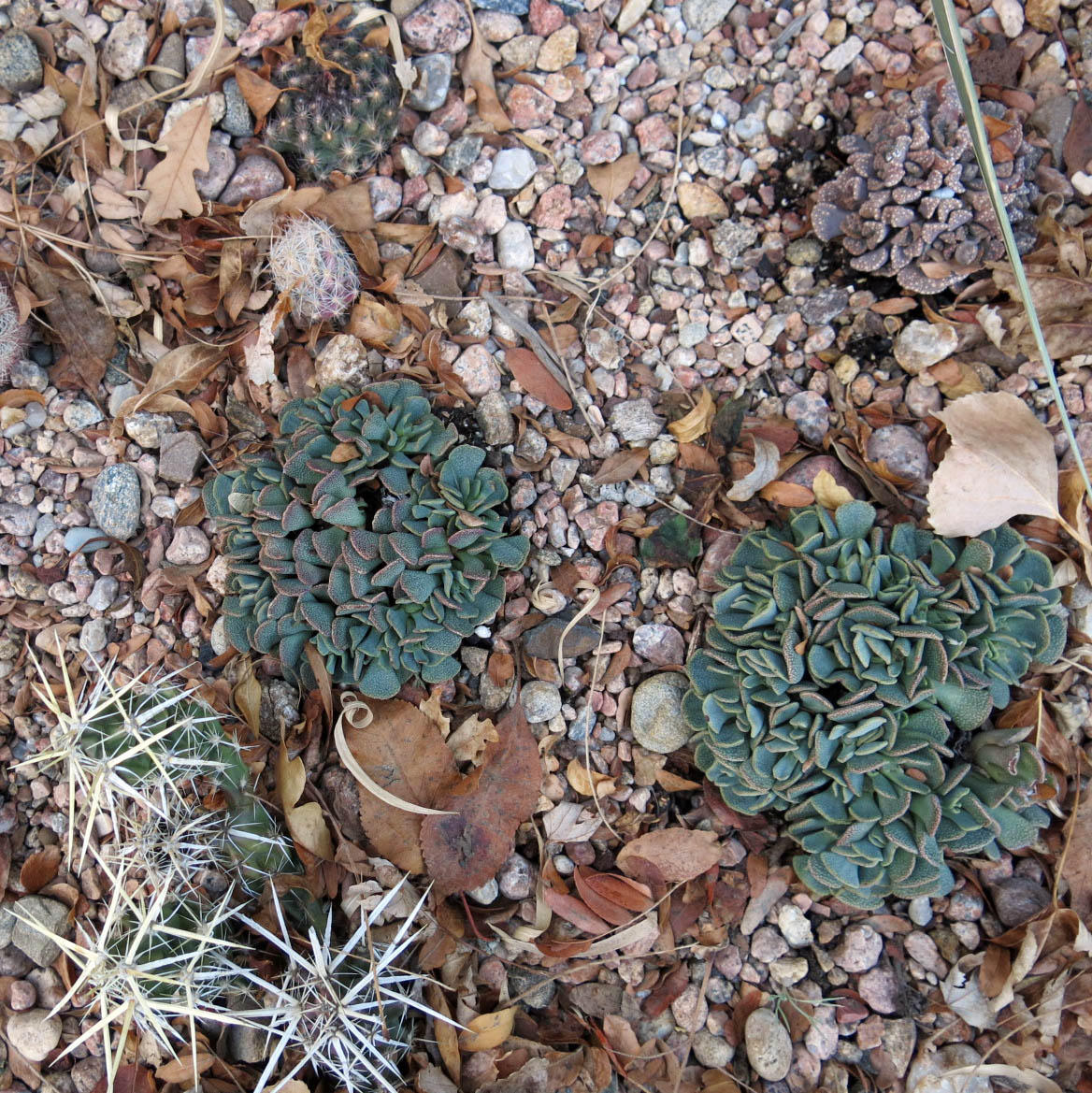 The squishies in the front garden, which he’s shown before, are fine, though maybe the flowers on the titanopsis (T. calcarea) won’t be blooming after all that below zero (F) weather early in December. Now he says he needs more, to try in this bed in the front yard.
