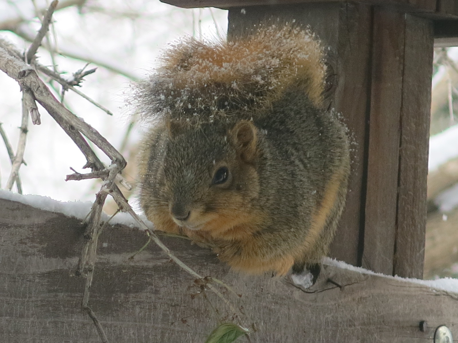 It could be a she. There were terrific squirrel fights on the patio today, trying to find the best place to curl up and stay warm. The snow stopped, and the sun came out. It’s supposed to be 60F tomorrow.