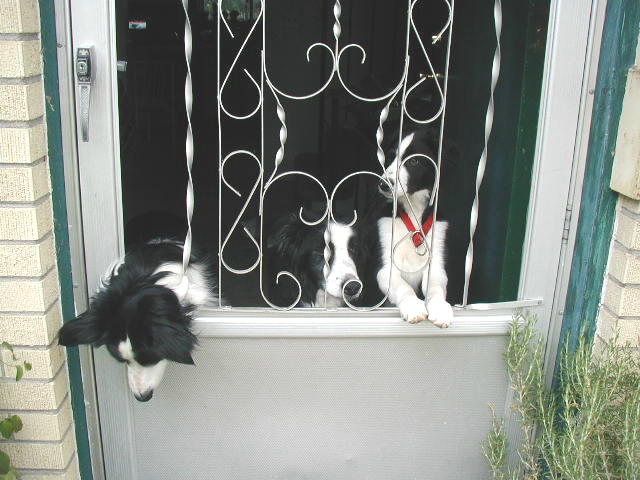 But, ever resourceful, the guy I live with found some of my mommy’s pictures, and I’ll post some right now. Here’s one of my buddy Slipper, looking down, and my grandpa Flurry, and me. I’m the cute one with the red collar. You can see what good front door guards we were.