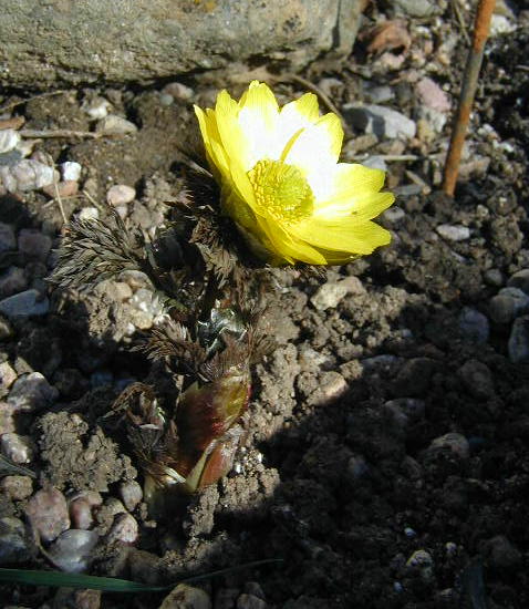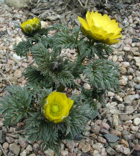 Posing for my picture was about all I did today, besides my walks. There’s snow on the ground, it was a little chilly, and the guy I live with had to go out for a while this afternoon, so we didn’t really do anything gardening-wise. It’s hard to believe that back in the last century, at least according to the guy I live with since I wasn’t born yet, that Adonis amurensis could be starting to bloom right about now. Here are some pictures of it from days long past. These are similar to ones he posted before, but not quite the same.