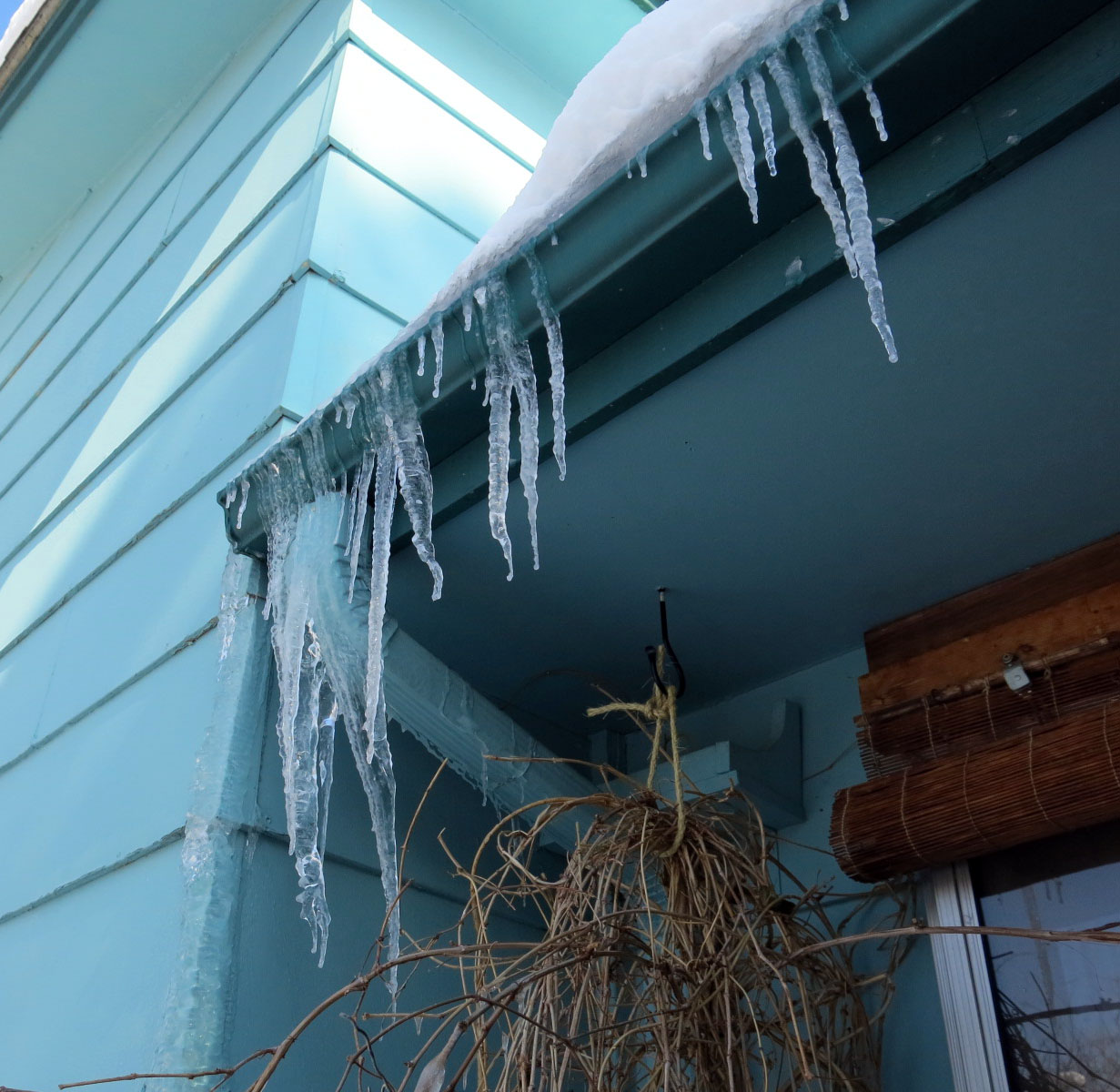 Today’s post is more of a weather report than anything else. You might say it’s a little chilly here. In fact….well, just look at the gutter he didn’t get to. That little shelf, by the way, is a nesting shelf my mommy made. Birds use it to make nests. The grape vine (Vitis riparia, the native grape, sown by a bird) has to be held up by a rope because there was chicken wire wrapped around the downspout for the grape, but the downspout blew apart last winter, because of freezing, and so he had to fix it, and the grape vine had to be removed, and he just hung it like this until he thinks of something else to do with it.