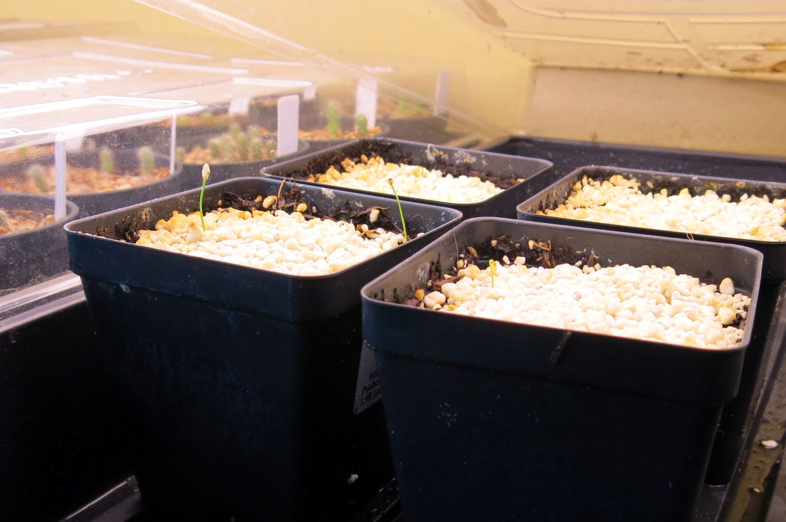The seeds were stratified for about a month, which breaks down the abscisic acid, the germination inhibitor, and then the seeds germinate. It doesn’t always work this elegantly, he says.
