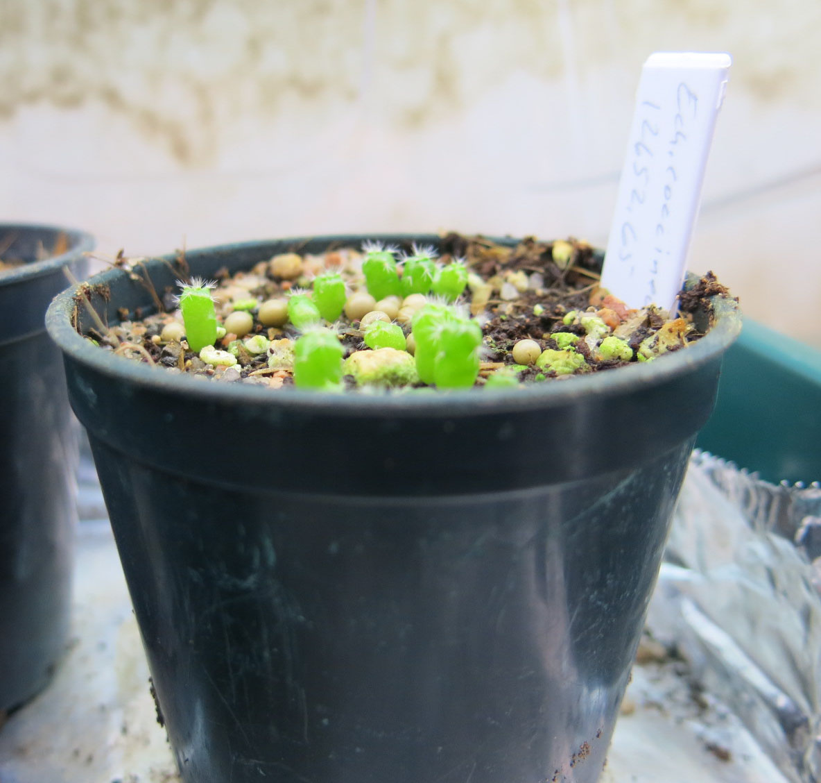 The guy I live with claims it’s more fun to look at seedlings in the house than stand outside freezing. I like standing outside, but there’s an awful lot to be said for central heating. His picture of the baby cactus could have been more in focus, if you ask me. These are seedlings of Echinocereus coccineus, and were germinated without using GA-3, which he says it’s important to say. It must be, then.