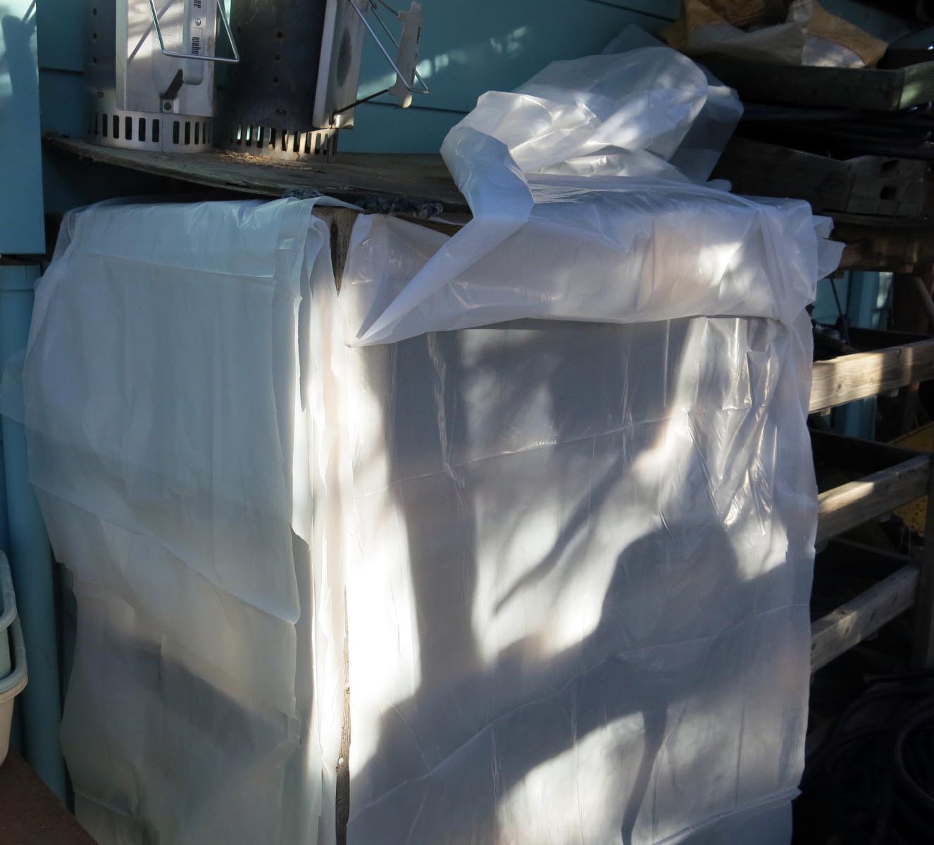 He also moved all the pots in the garage refrigerator back out to the shelves on the patio, and covered them with a double layer of plastic. This is especially attractive.