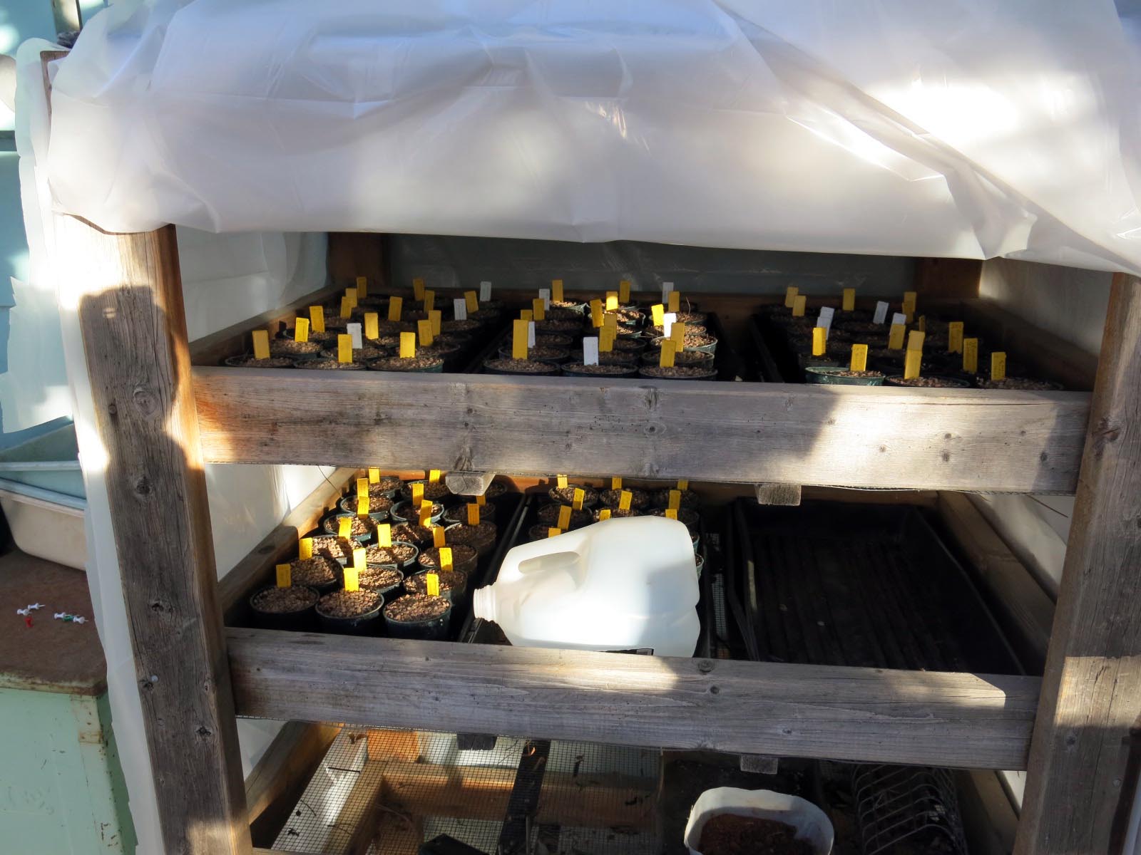 When the plastic flaps in the wind, it’s pretty scary, but you can see how he takes care of that in the next picture, if you look closely, and the picture also shows the seed pots nestled on the shelves. He thinks “nestled” sounds more positive than “sitting”. He’s sown seed this way for almost a quarter century now. When something starts to happen in one of the pots, the pot gets moved out into a frame on the trough patio to be in more or less full sun. The pots are in plastic trays that can be filled with water; drying out is the biggest danger, he says.