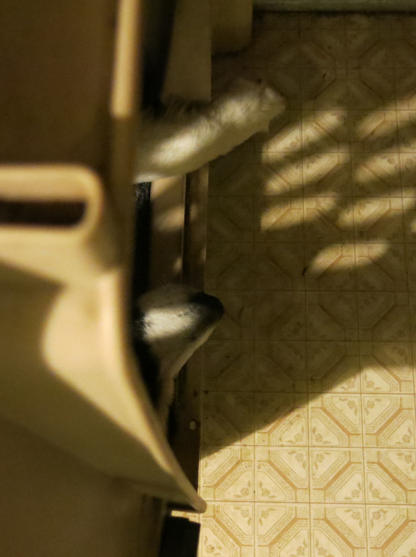 There was a lot of racket in the Tin Cat last night, but when the guy I live with went down to check, there was a really little mouse in it who could get out again. Never seen that before. He thinks the mouse didn’t weigh enough to push down the ramp. He told me all this because I was snoring so loudly I didn’t hear anything.