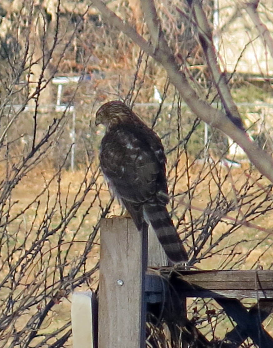 Oh, something else. This is pretty cool, but at the same time, scary. A hawk flew into our back yard yesterday morning. The guy I live with tried to get excellent hawk pictures, but the paths were so icy he had to try to take pictures while at the same time not slipping and breaking the camera, not to mention a leg or anything. He looked at the Cornell website and decided this was a juvenile Cooper’s hawk.
