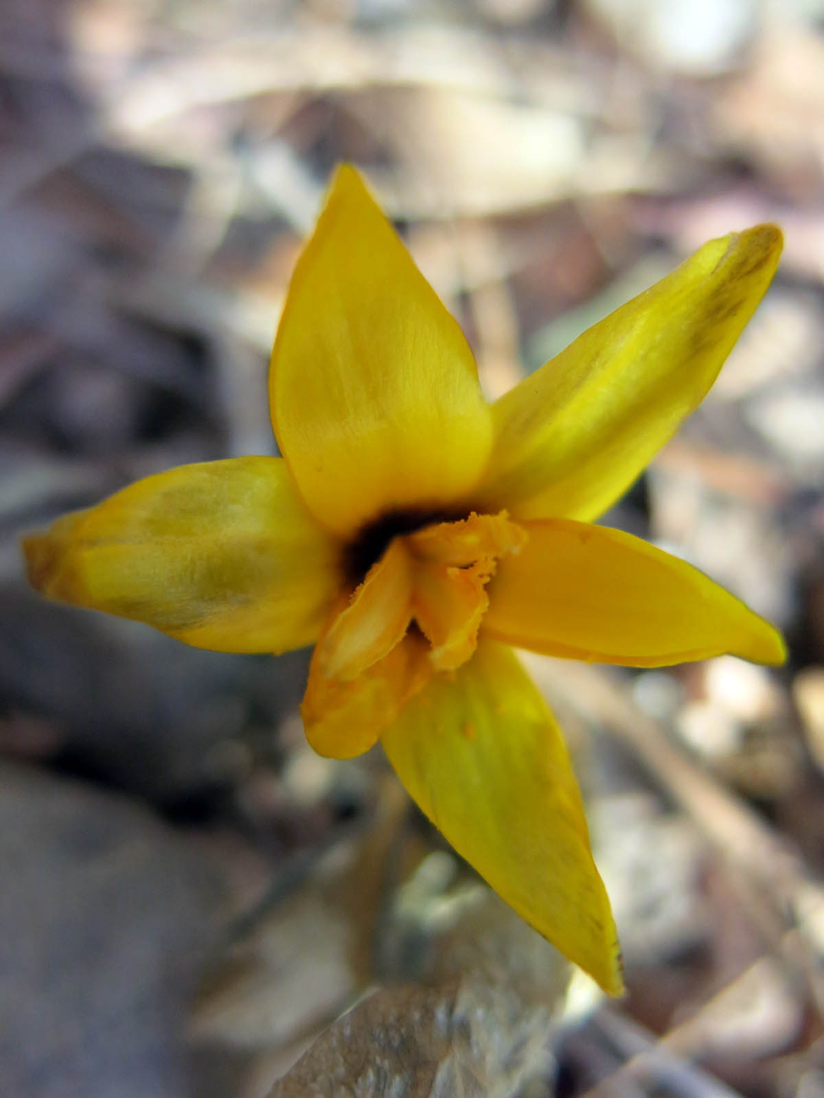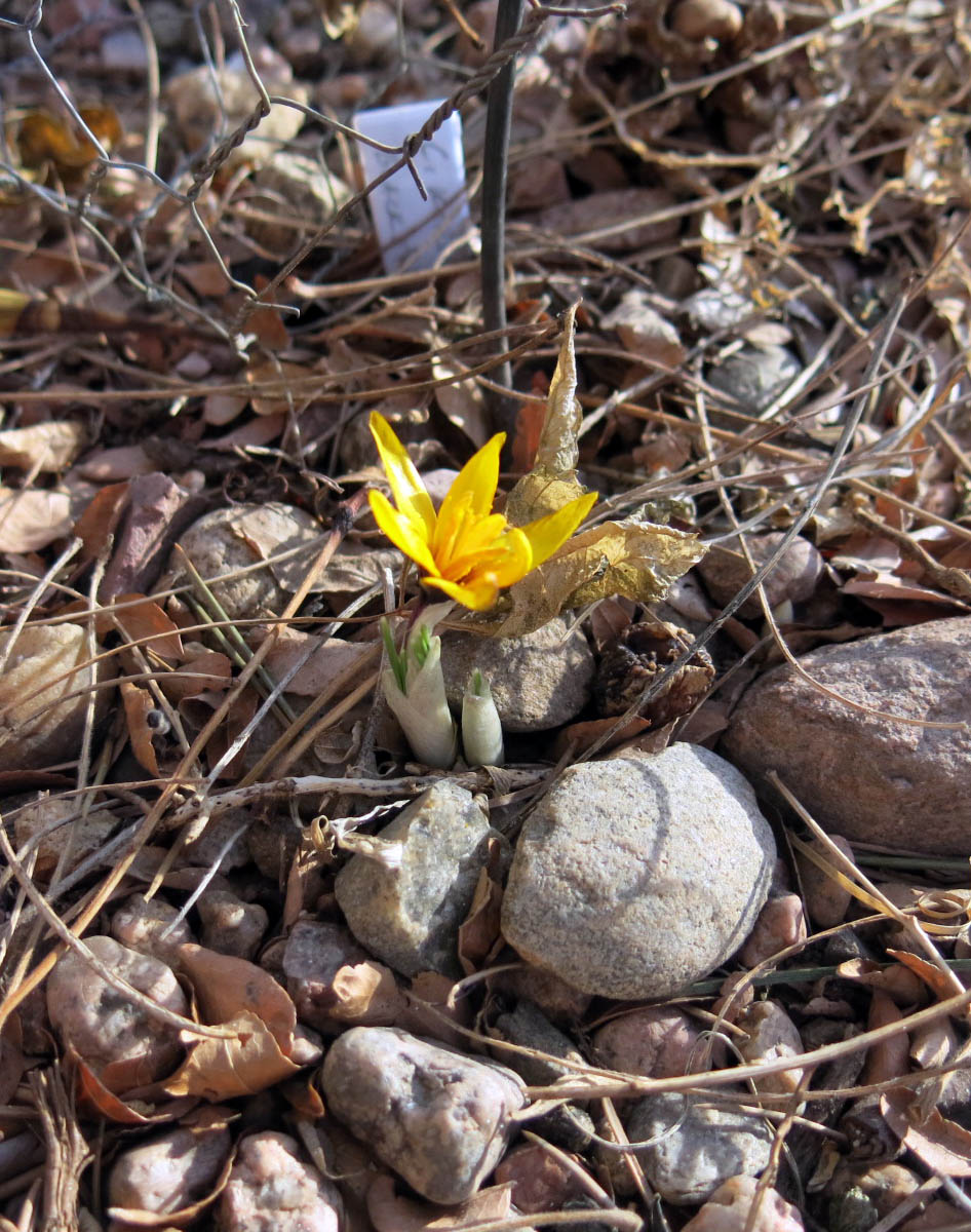 It was a bit battered from last night’s wind, and the freezing cold morning, but he was happy about it nonetheless. He was much less happy discovering that some other crocuses had been nibbled by the rabbit. You might say he was hopping mad. He sprayed some anti-rabbit spray and put down more chicken wire. But, anyway, the crocus was blooming. This is Crocus korolkowii ‘Black Eyed Beauty’.