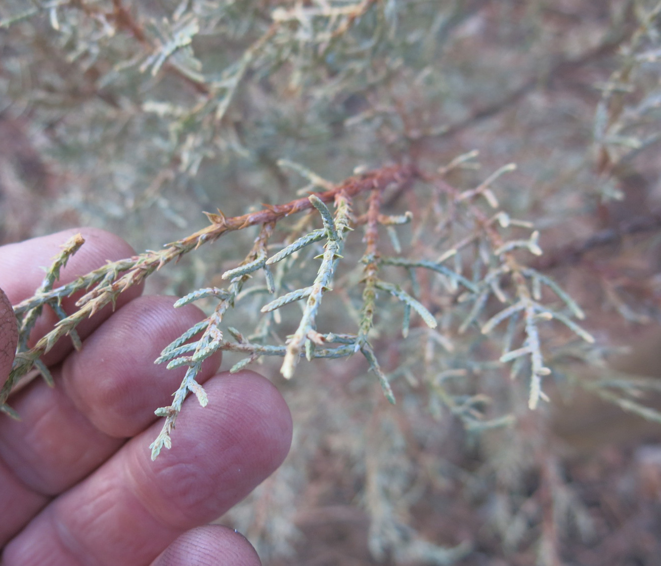 It was a fairly big tree grown in a fairly small pot, and even though he knows better, he forgot to loosen the roots before he planted the cypress and so it never drew up enough water to make the “cryoprotective soluble sugars” which it needs in order to make it through the winter. This doesn’t just happen; water is necessary to make the solution. The sugar solution lowers the freezing temperature of the water between the cells and keeps the plant from exploding when it gets really cold.