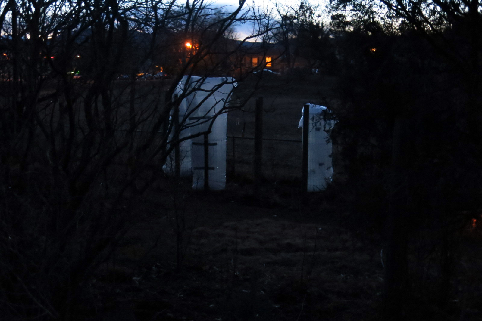 The guy I live with took some pictures of “the three towers” last night. The cypresses in their personal greenhouses, I mean. They’re kind of spooky at dusk, don’t you think?