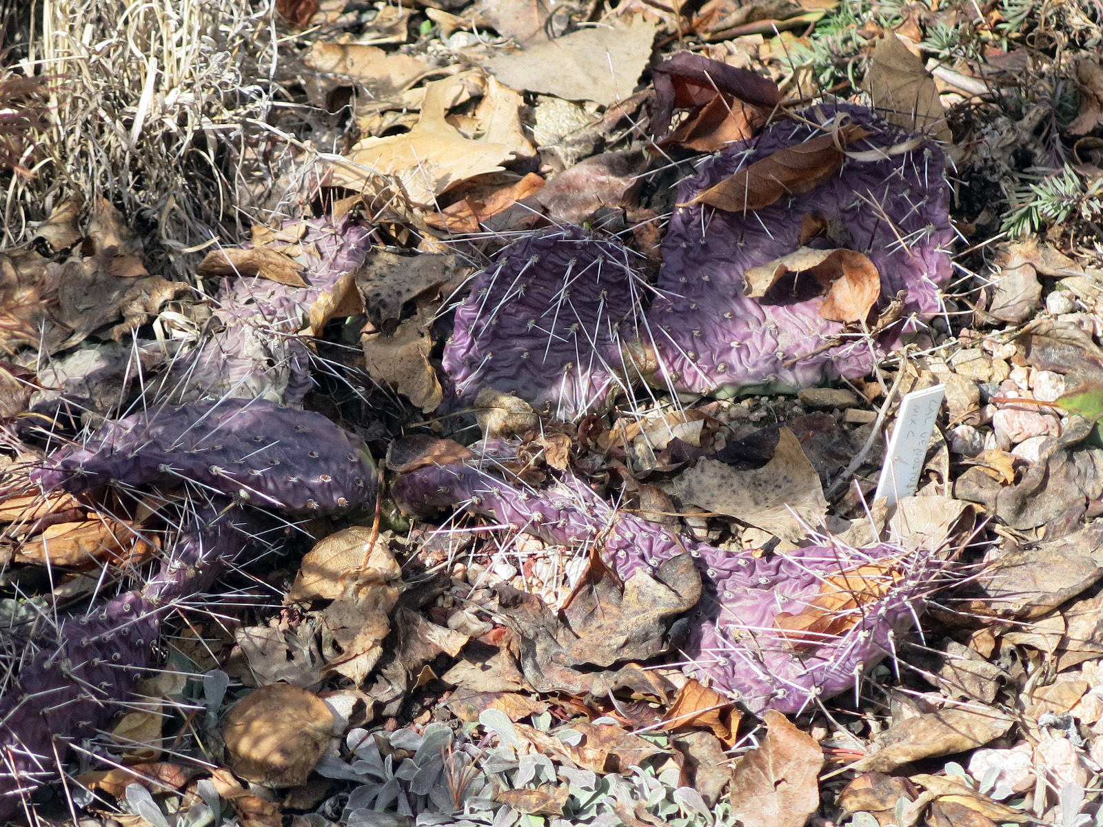 The extra purple pads of Opuntia polyacantha ‘Dark Knight’. They turn greener when the weather warms, the cells fill with water again, and the pads stand upright.